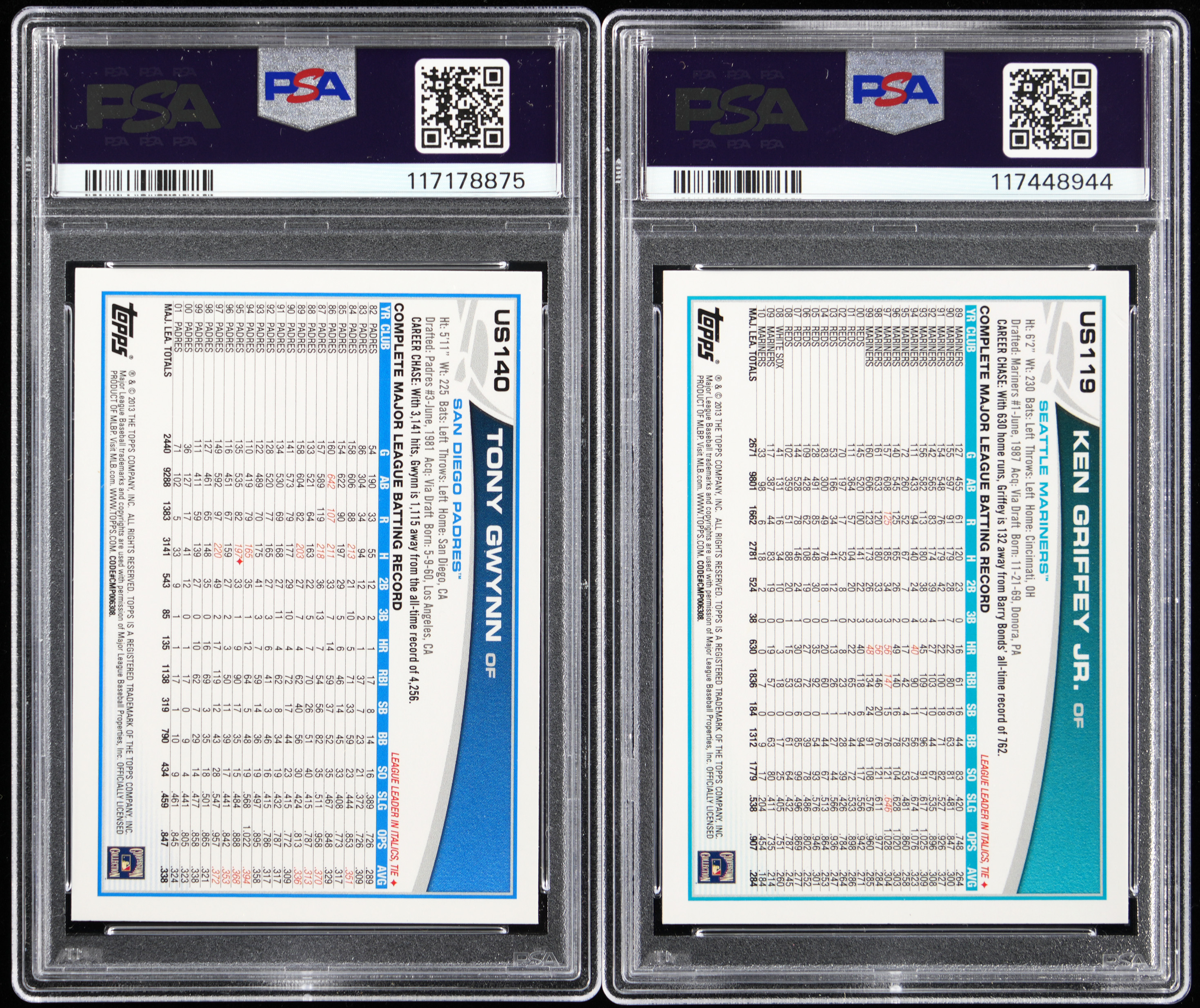 Each graded by PSA. Die-hard Ken Griffey Jr. player collectors will want to bid strong for the offered pair of 2013 Topps super shortprints. The following SSPs of the Seattle Mariners Hall of Famer are present: 1.) 2013 Topps Update #US119 (PSA EX-MT 6, only 17 total graded) and 2.) 2013 Topps Update #US140 with Tony Gwynn (PSA MINT 9, only 8 total graded).