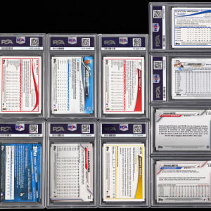 Each graded by PSA. Complete multiple player collections with these (10) 2013-2021 Topps product Hall of Fame and star shortprints and super shortprints. The following elusive variations are present: 2013 Topps: #27 Trout (PSA MINT 9, Catching); 2013 Topps Update: #US150 Cole RC (PSA EX-MT 6, Black Jacket); 2014 Topps: (2 cards, both PSA NM-MT 8) with #1 Trout (Sparkle on Cleat), #400 Kershaw (NL West Champs Fence); 2017 Topps Update: #US50 Bellinger (PSA MINT 9, Pointing Up); 2018 Topps: #555 deGrom (PSA MINT 9, Wearing Helmet); 2020 Topps: (2 cards) with #420 Betts SSP (PSA MINT 9), #467 McCutchen SP (PSA NM-MT 8); 2020 Topps Update: #U124 Ortiz SSSP (PSA EX-MT 6) and 2021 Topps: #266 R. Alomar Ultra SP (PSA MINT 9).