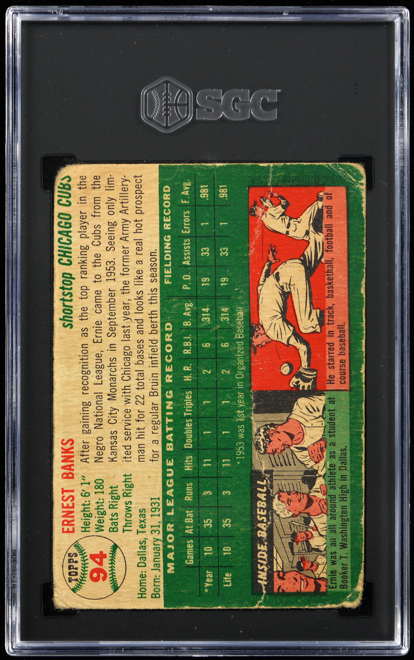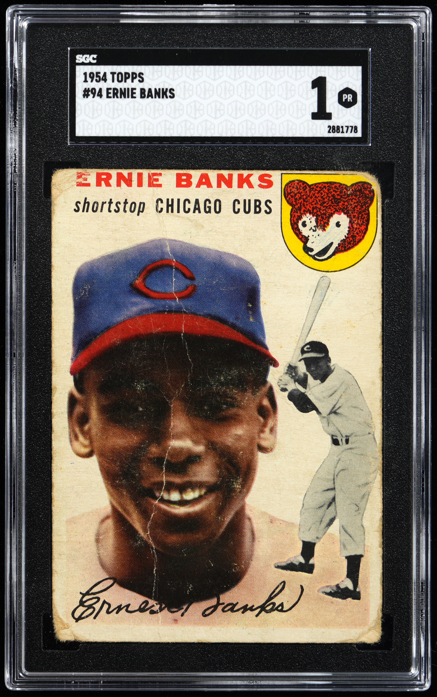 Graded POOR 1 by SGC. "Mr. Cub" is well loved on this original 1954 Topps #74 Ernie Banks rookie card. Despite a combination of acute creasing and overall wear, this Chicago Cubs Hall of Famer still presents admirably.