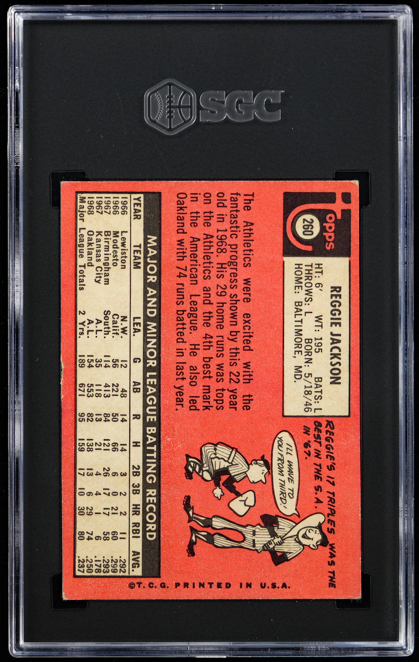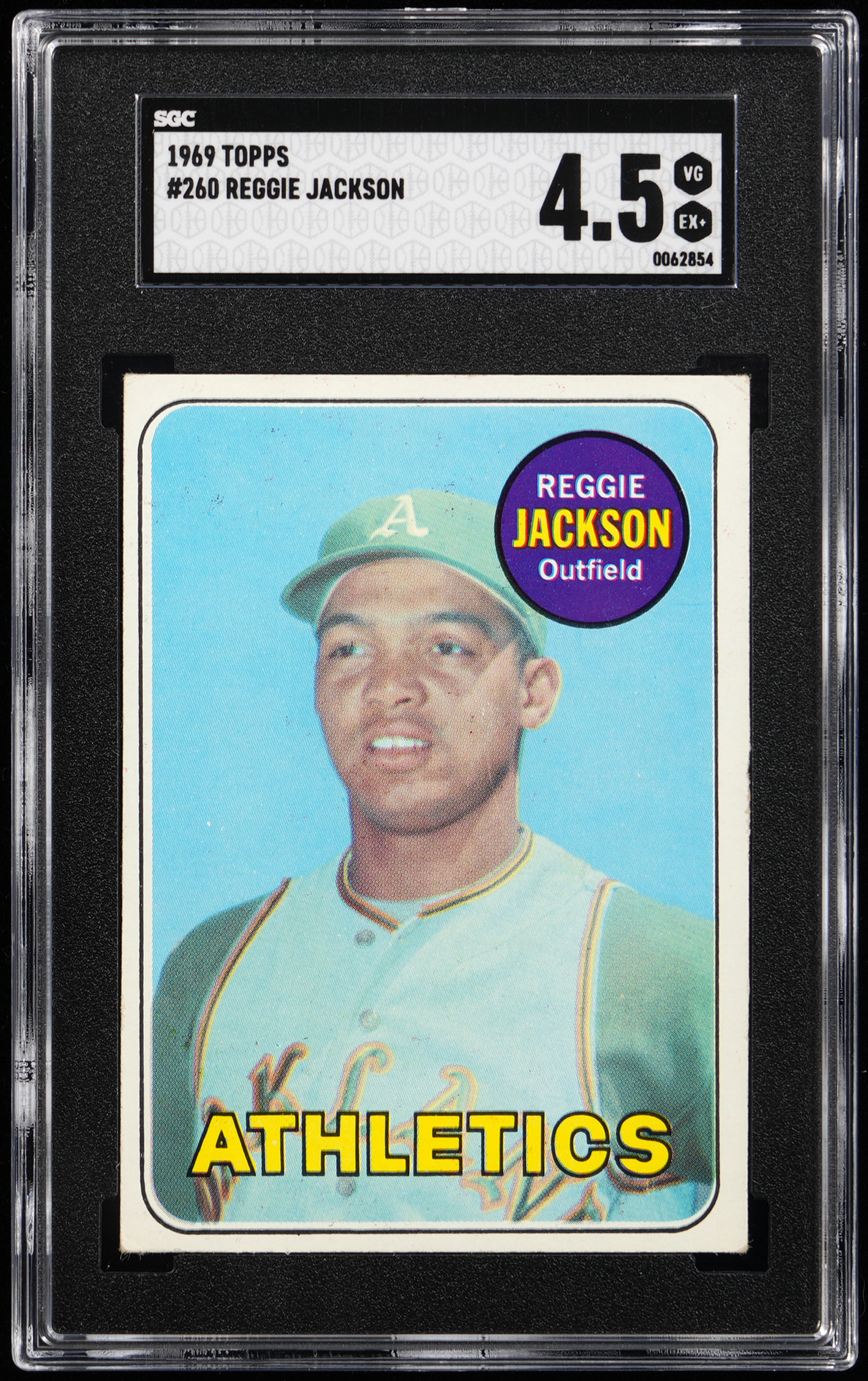 Graded VG/EX+ 4.5 by SGC. "Mr. October" makes a splash on the offered 1969 Topps #260 Reggie Jackson rookie card.