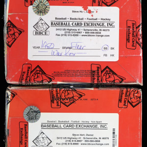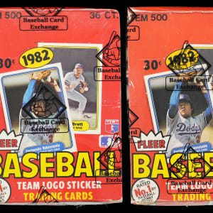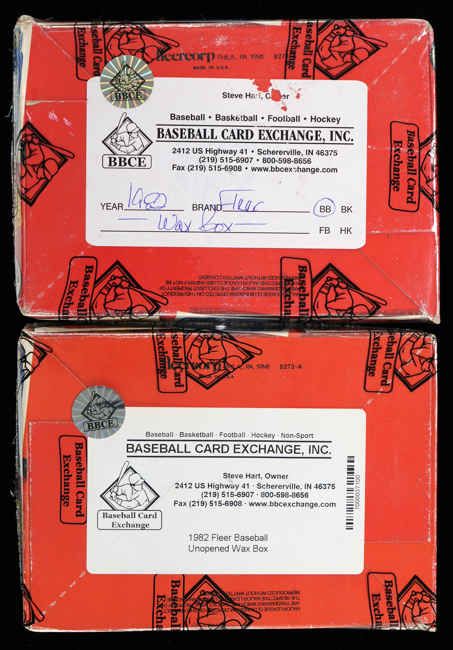 Unsearched pair of 1982 Fleer unopened wax boxes. These 36/15-card packs (plus sticker per) could deliver high-grade Cal Ripken Jr. rookies! Each box comes shrink-wrapped by Baseball Card Exchange (owned by Steve Hart, the foremost expert on unopened material). The size/weight of this item requires that there will be an additional shipping charge for this lot.