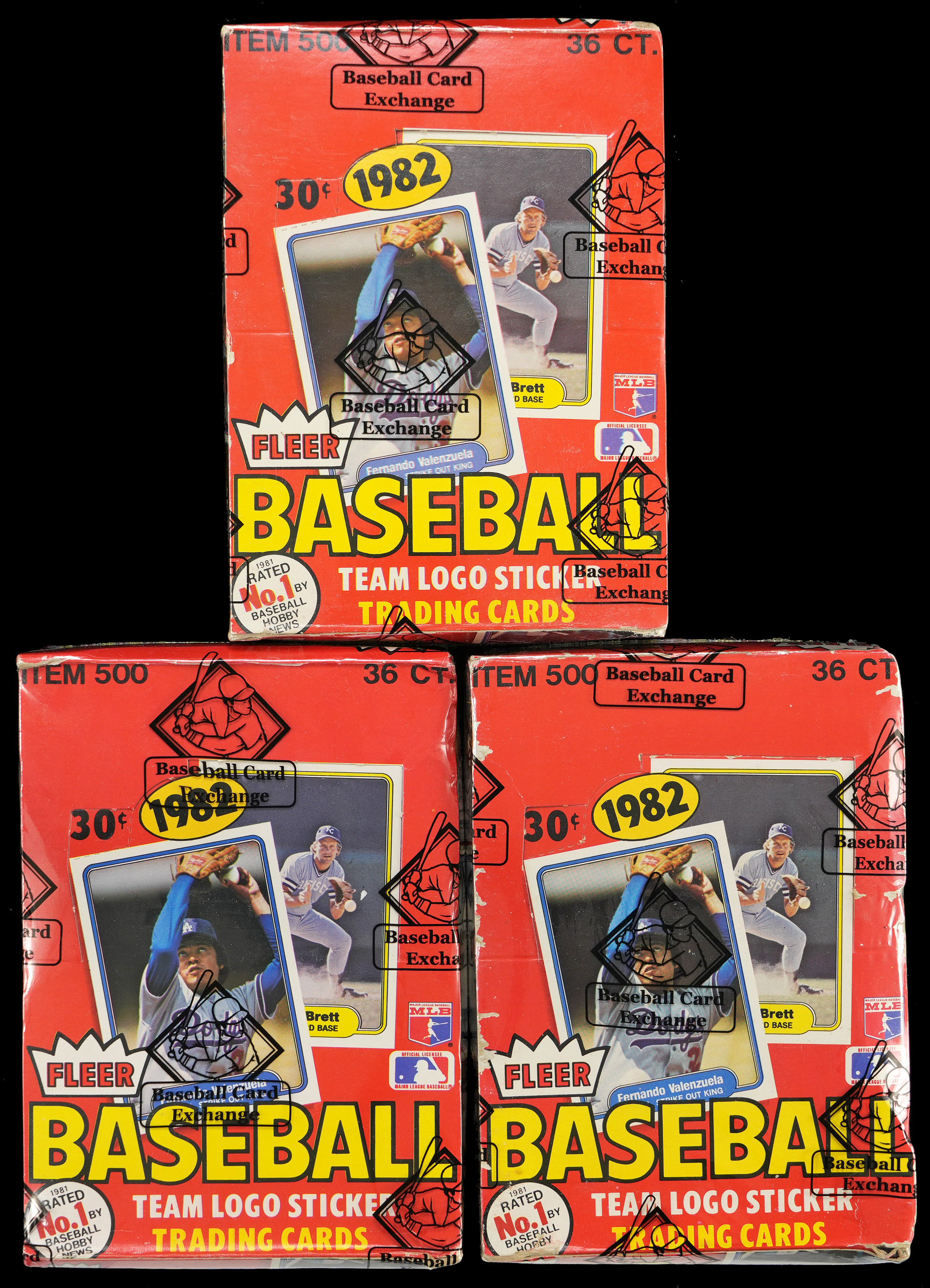 Showcased is a trio of 1982 Fleer unopened wax boxes. These 15-card packs (plus sticker per) could deliver high-grade Cal Ripken Jr. rookies! These boxes come shrink-wrapped by Baseball Card Exchange (owned by Steve Hart, the foremost expert on unopened material).