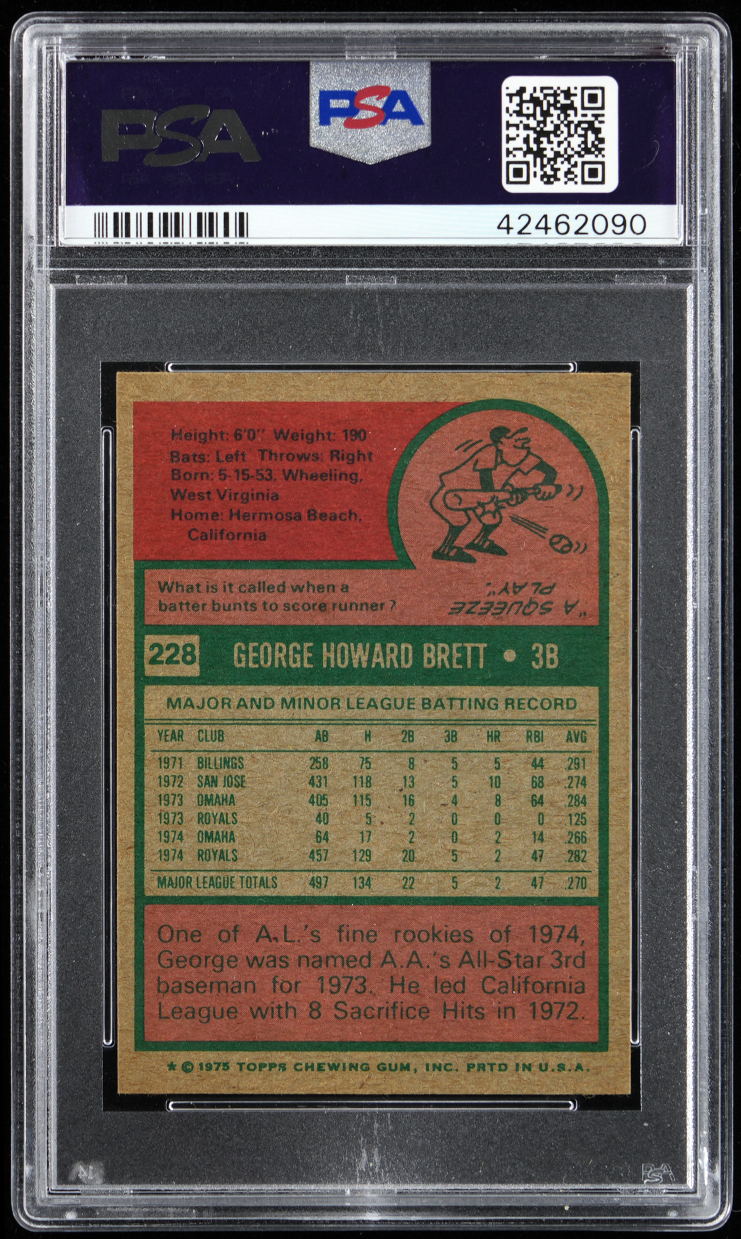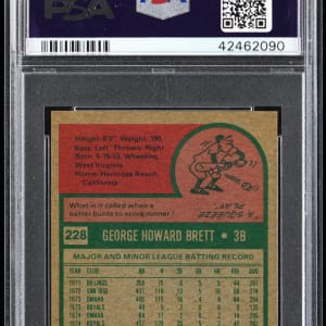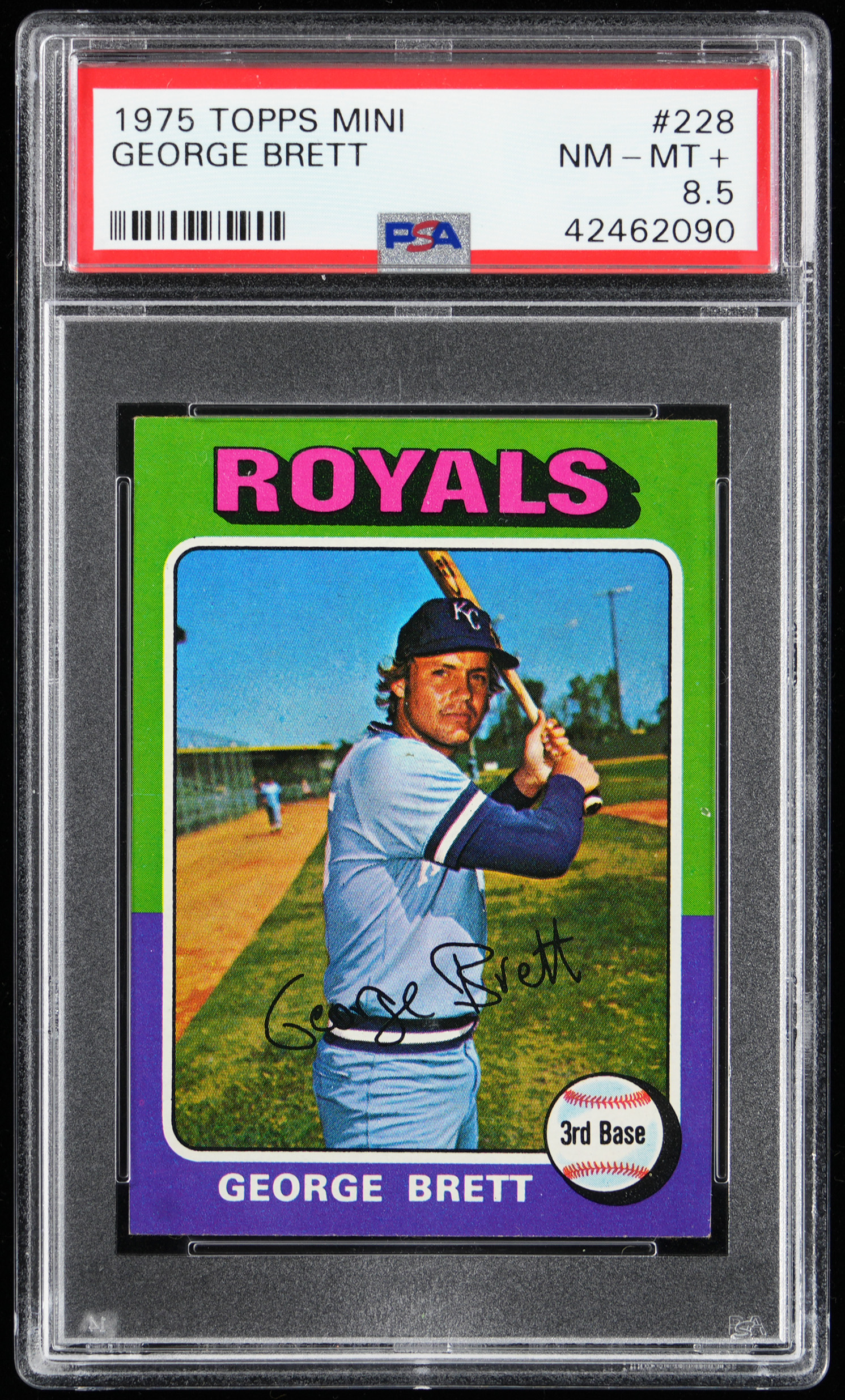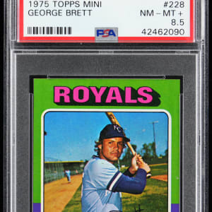 Graded NM-MT+ 8.5 by PSA. Spectacular 1975 Topps Mini #228 George Brett rookie that gloriously portrays the Kansas City Royals Hall of Famer at the dawn of his 3,000+ hit career. A centered blazer that ranks in the upper 5% of all similar copies judged by the authenticator.