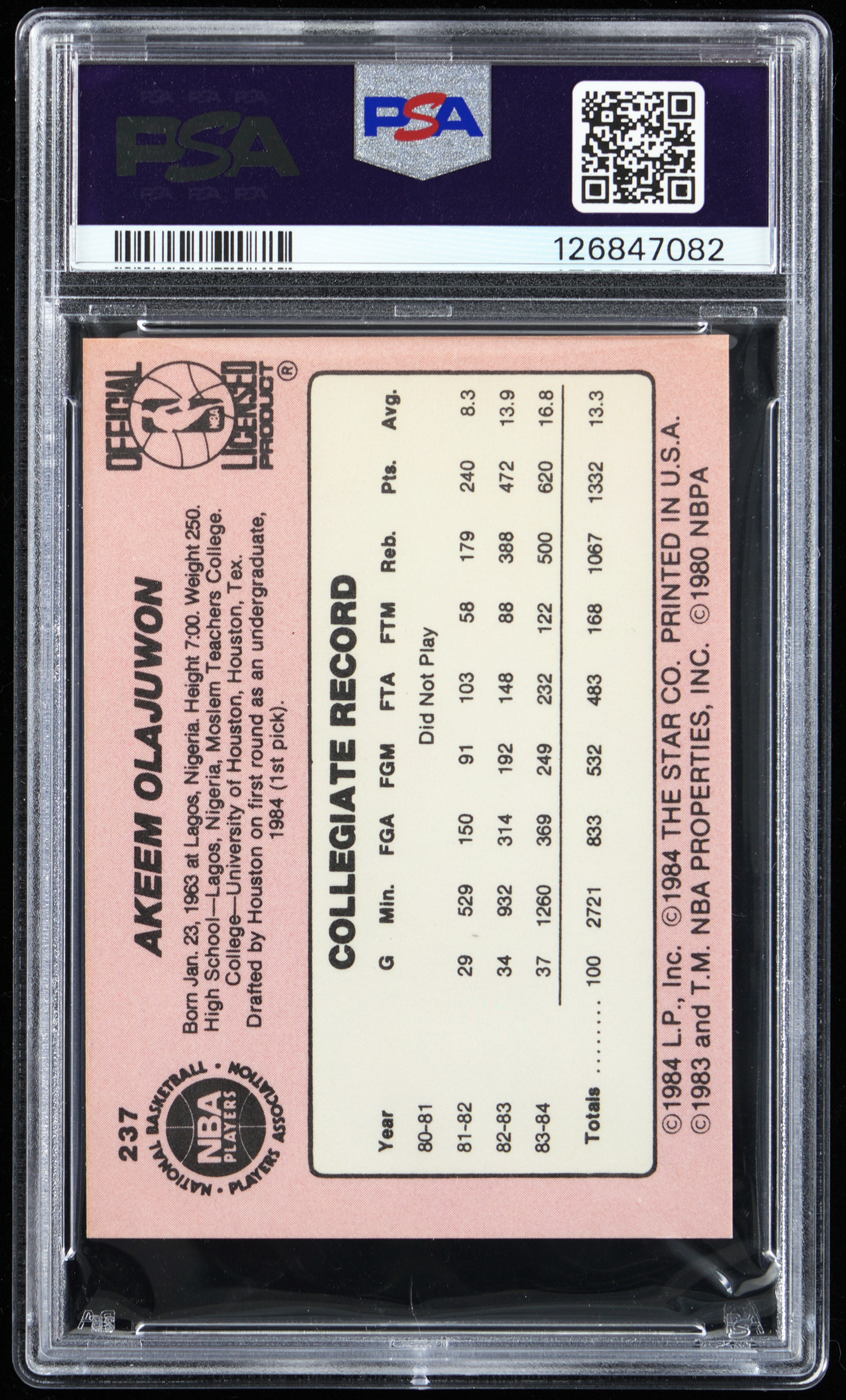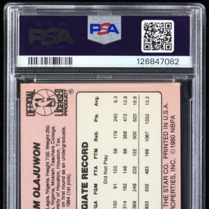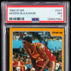 Graded NM 7 by PSA. Akeem (The Dream) Olajuwon dominates on his 1984-1985 Star Basketball #237 rookie card. Houston Rockets Hall of Famer.