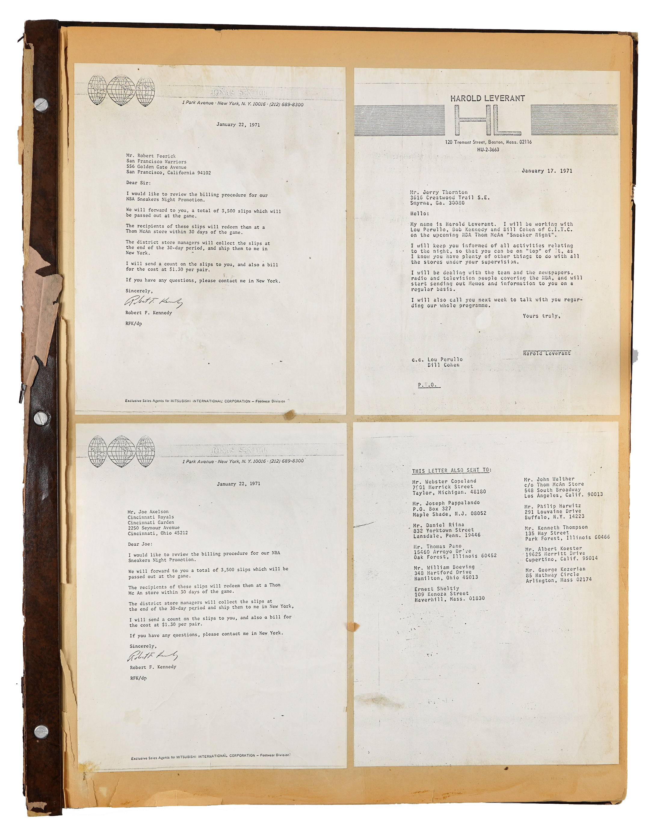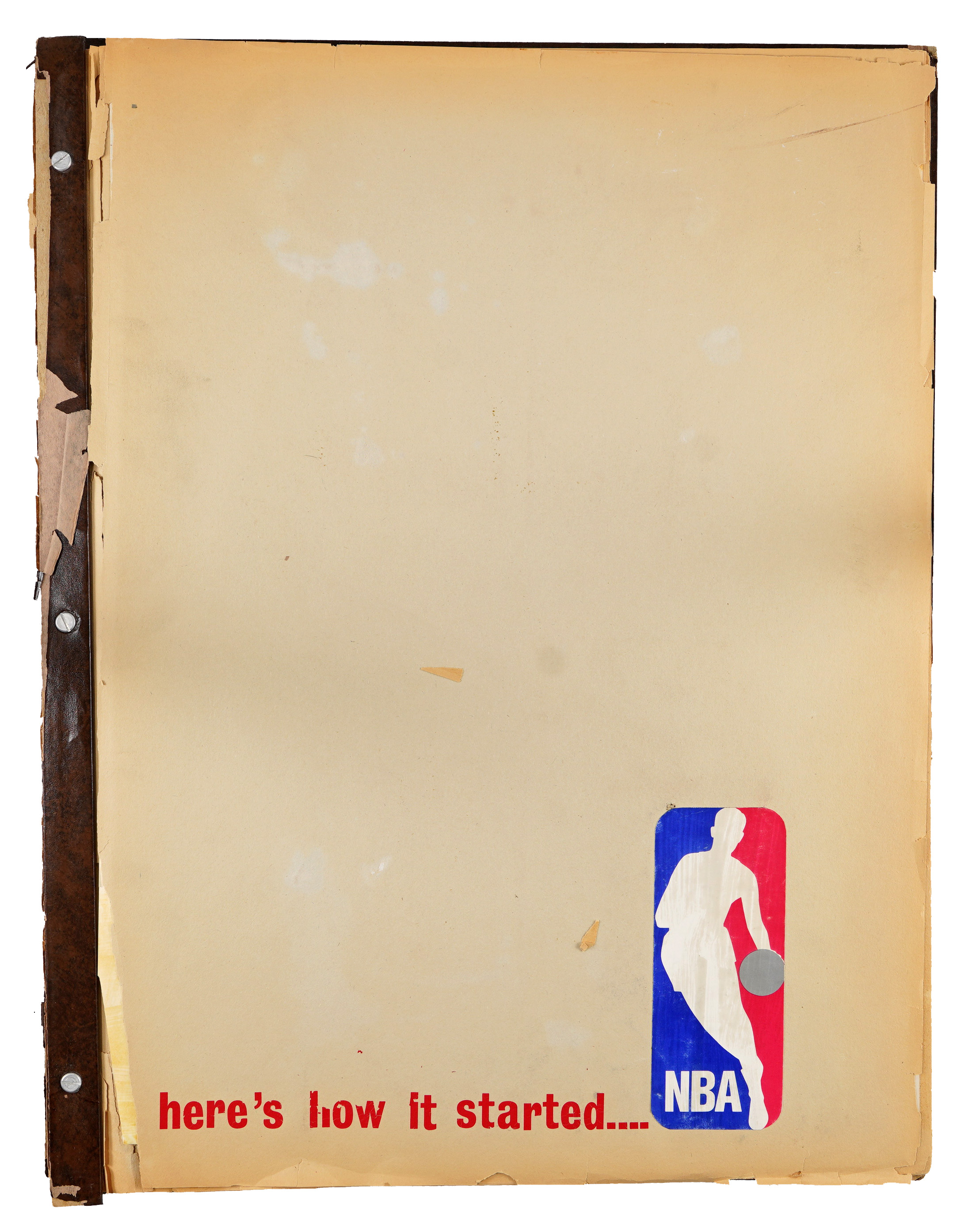 This is huge! 20x25 to be exact, and 2-inches thick. This one-of-a-kind leather-bound scrapbook appears to have been put together by an executive of the Thom McAn Shoe Company. The front is embossed in gold letters “THE NBA-THOM MC AN GIVEAWAY PROMOTION” and is full of letters, posters and photos. It begins with letters from the Thom McAn Shoe Company to various NBA teams detailing their involvement. The first page even features the statement “Here's how it started” followed by the NBA logo. The scrapbook features posters for the giveaway events around the NBA, as well as over 100 black and white photos featuring the executives and players in street clothes. The inside pages are still bound together by a screw binding, but the front and back covers are detached. The contents have been pasted on each page and are in strong condition.