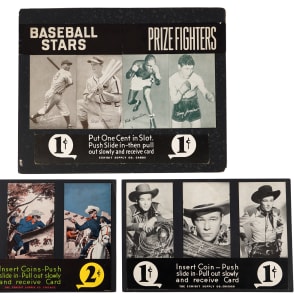 Baseball Hall of Famers. top ranked boxers, and western heroes all make the scene, in this selection of (3) 1940s-1960s Exhibit card panels. These vintage promoters were employed as headers in period Exhibit Supply Co. vending machines. Each header is formatted with actual Exhibit cards, rather than paper versions. Spanning the bottom of each panel, are operating instructions for the use of the machines, and price indicators announcing the cost of liberating a random card from a machine. The cards present handsomely, the backers show moderate, age-appropriate wear, and all three project abundant display appeal.