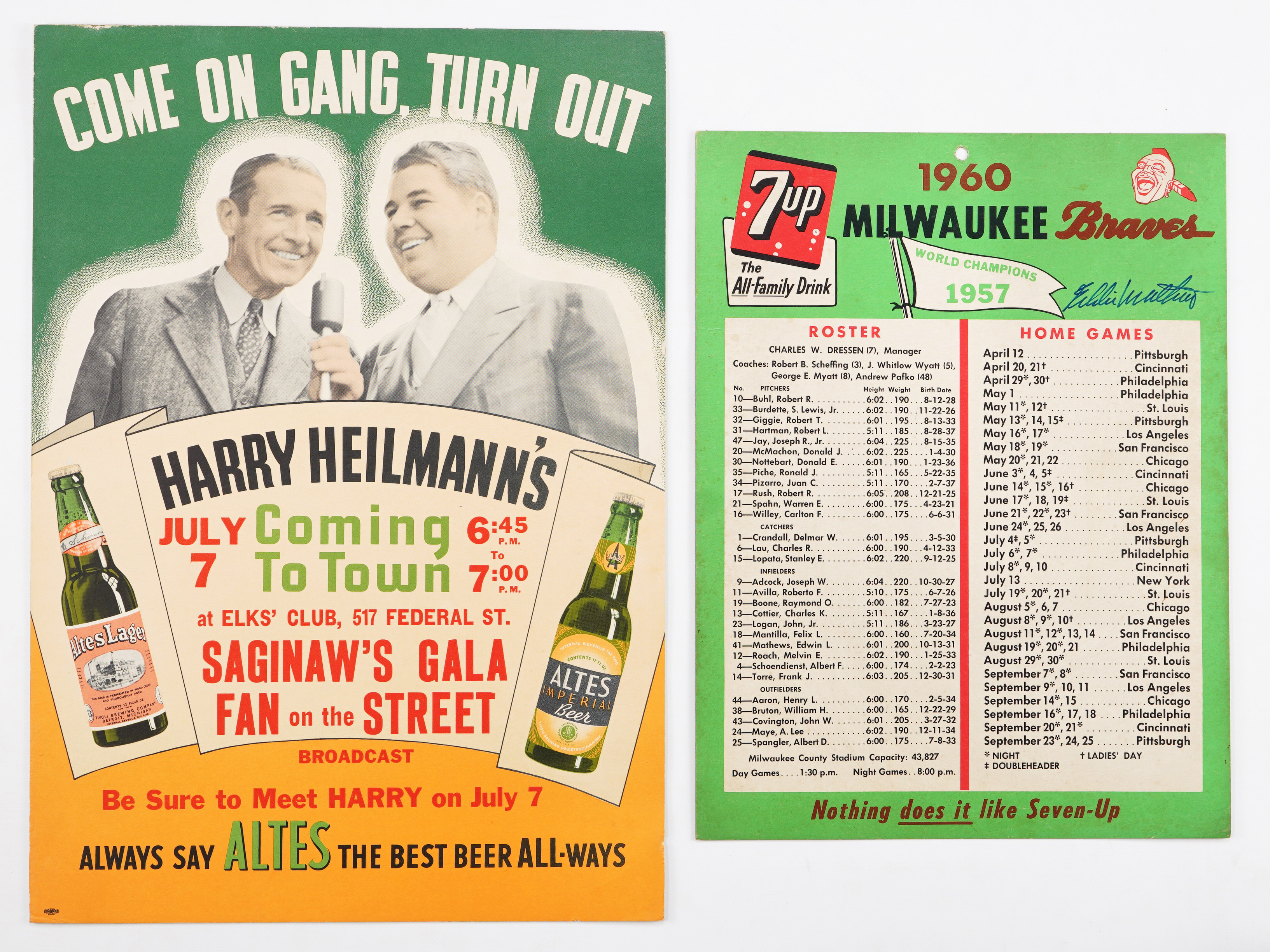 4) 1960 Milwaukee Braves – “7up” Roster and Home Games (13 ½ x 10) with Eddie Mathews facsimile signature.