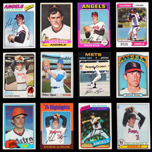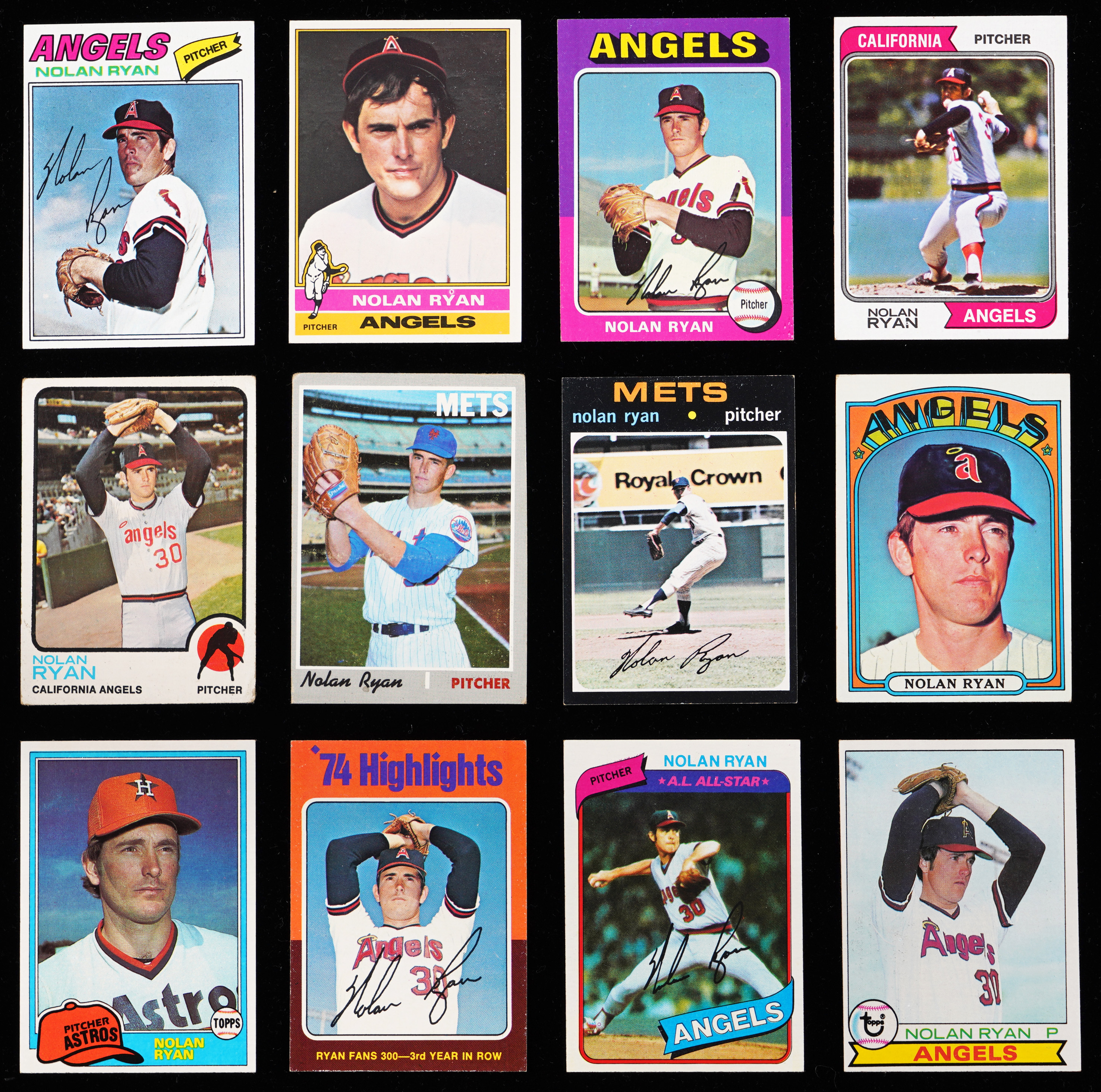 1970s Nolan Ryan: (20 cards, average VG to EX) with 1970 Topps: #197 Playoffs (GD), #198 Mets Celebrate (VG-EX), #712 (GD); 1971 Topps #513 (EX), 1972 Topps #595 (VG), 1973 Topps: #67 Carlton/Ryan LL (VG-EX), #220 (GD); 1974 Topps #20 (VG-EX), 1975 Topps #5 HL (EX-MT), #500 (EX); 1976 Topps #330 (EX-MT), 1977 Topps: #234 RB (EX-MT), #650 (EX-MT); 1979 Topps #115 (EX);