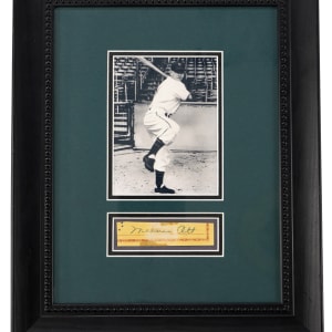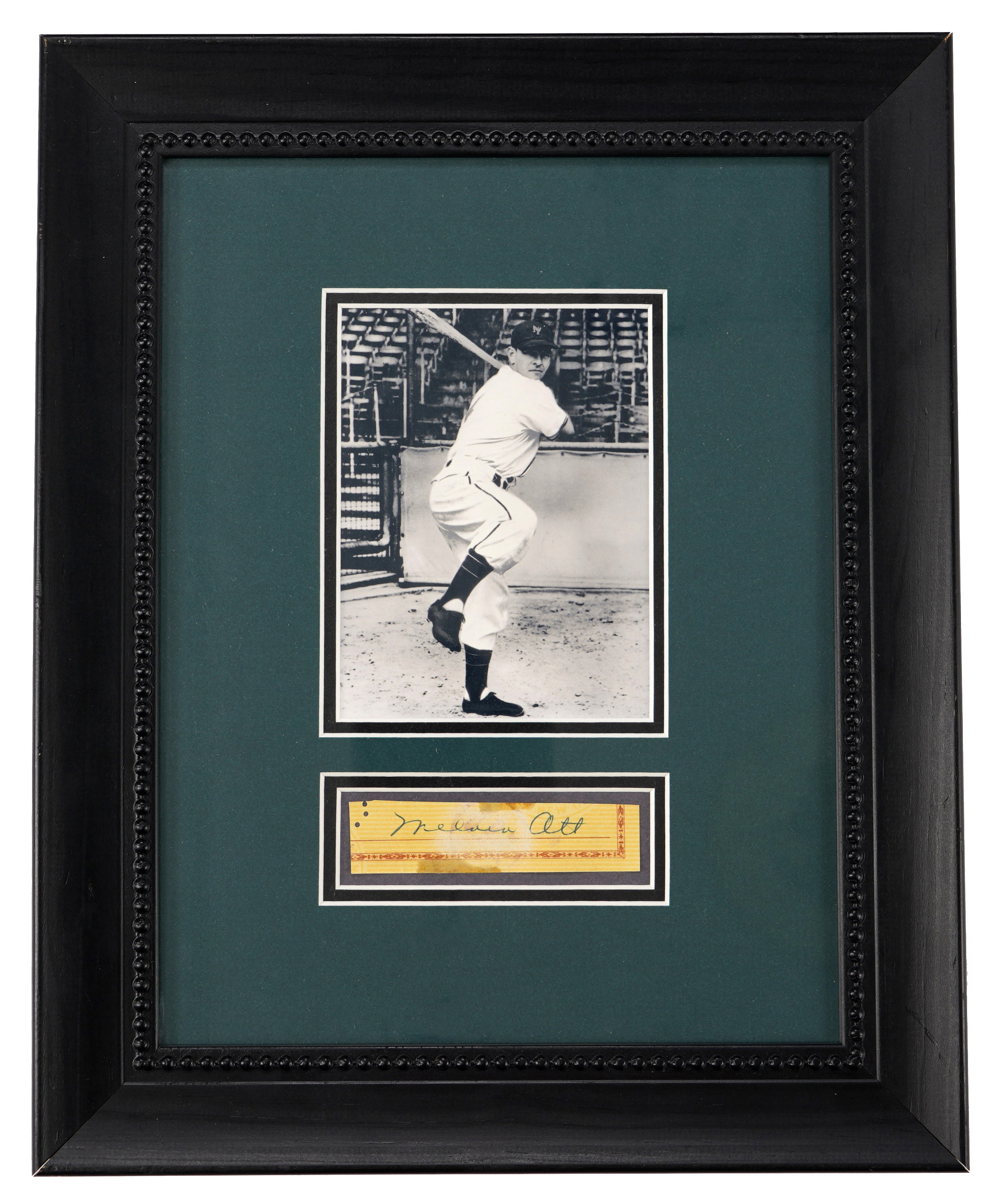 (Master) Melvin Ott (d.1958) was a magician at the plate who swatted 511 home runs over his 22-year career with the New York Giants. The Class of 1951 Hall of Famer is lovingly portrayed on this handsome signed check cut display. Handsomely framed and matted to overall 11 x 13-3/4" dimensions, this neatly pared ("8") blue ink autograph is crowned by a 4x5 black-and-white action pose. A choice piece that is ideal for prominent display in any baseball themed den or office. Auction LOA from James Spence/JSA. The size/weight of this item requires that there will be an additional shipping charge for this lot.