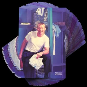 Postcard #1054 from the American Postcard Company features a handsome Mickey Mantle changing in front of his locker with a box of Viceroy cigarettes on the shelf. Mickey often appeared in advertising for Viceroy Cigarettes. This one is from the 1960s, near the end of his career. These postcards sell for $10 each or much more on eBay. This is a NR-MT brick of 70 plus. More Mantle for your money!