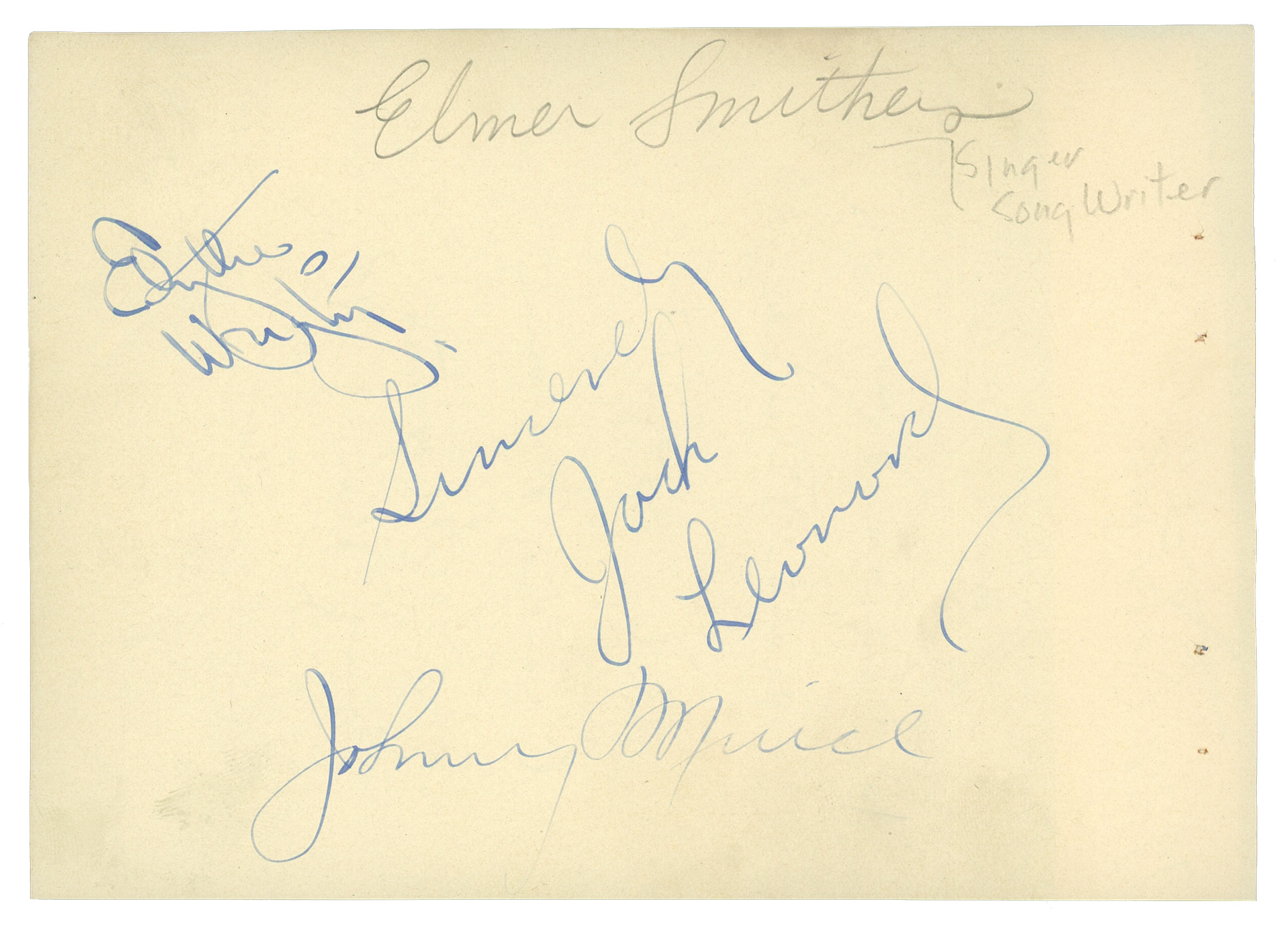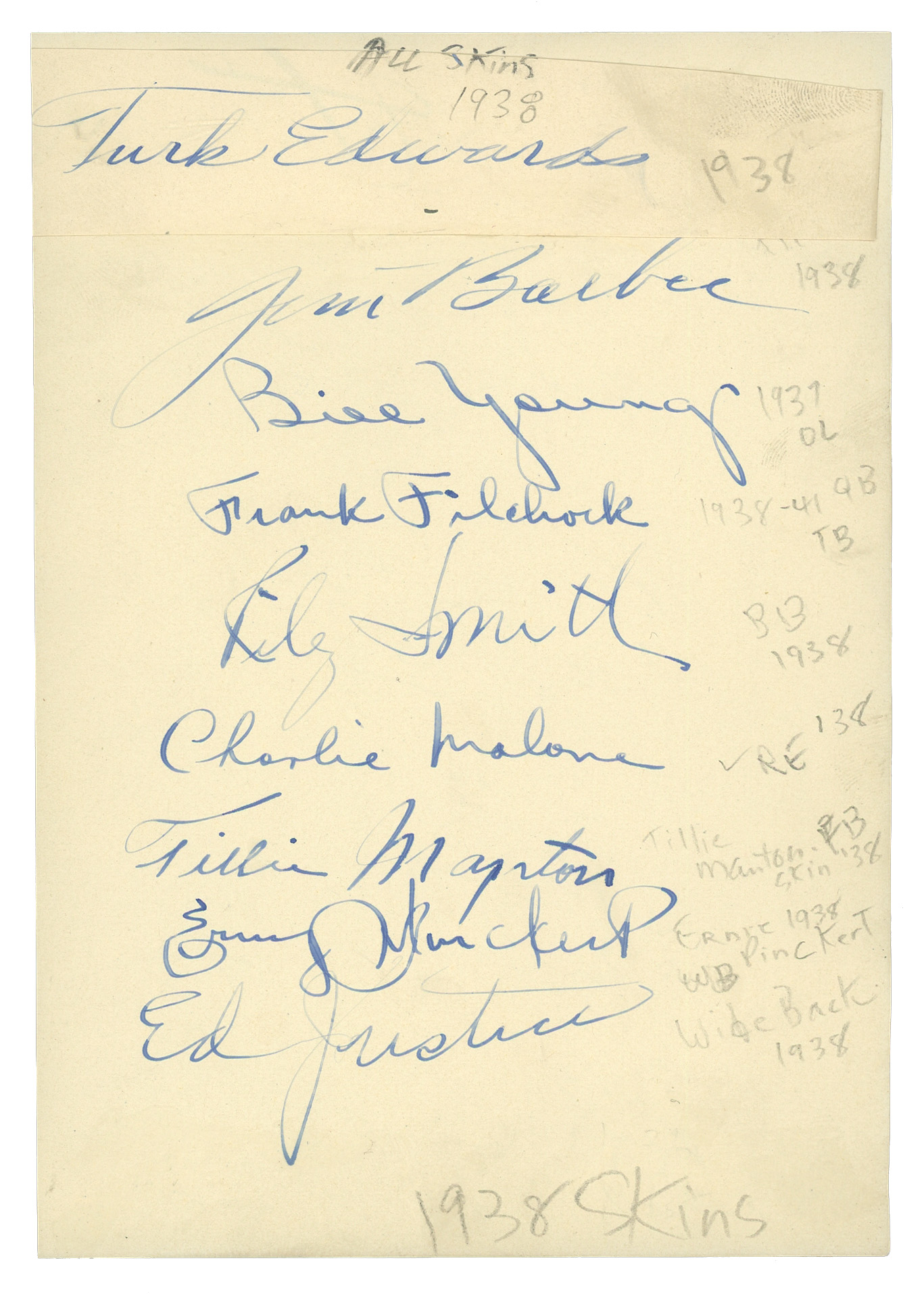 Trace the Washington Commanders' roots, with this 1938 Washington Redskins team-signed sheet. Founded in 1932 as the Boston Braves, this storied franchise rebranded in 1933 as the Boston Redskins. Playing in a city renowned for higher education, the NFL Redskins took a backseat to locally revered college teams, such as Harvard, Boston College and Holy Cross. In 1937, the team was relocated south, as the Washington Redskins. Sammy Baugh was taken 6th in the 1937 NFL Draft, and promptly led the Redskins to an NFL championship in his rookie season. Dating from the franchise's second season in DC, this 1938 Redskins sheet is signed by (9) members of the defending world champions. Topping the list of signers is an adhered signature cut from Hall of Famer "Turk" Edwards (d.1973), who is considered a tougher acquisition. The rest of the subjects are Jim Barber (d.1998), Bill Young (d.1994), Frank Filchock (d.1994), Riley Smith (d.1999), Charlie Malone (d.1992), Tillie Manton (d.1991), Erny Pickert (d.1977), and Ed Justice (d.1991). All signatures show a pleasing degree of integrity, and identifying notations by a fan are noted across the top, right, and bottom of the page. Seen on the back of the offered sheet, are (4) entertainer signatures, including Edythe Wright (d.1965), who sang with the Tommy Dorsey band during the late-1930s.