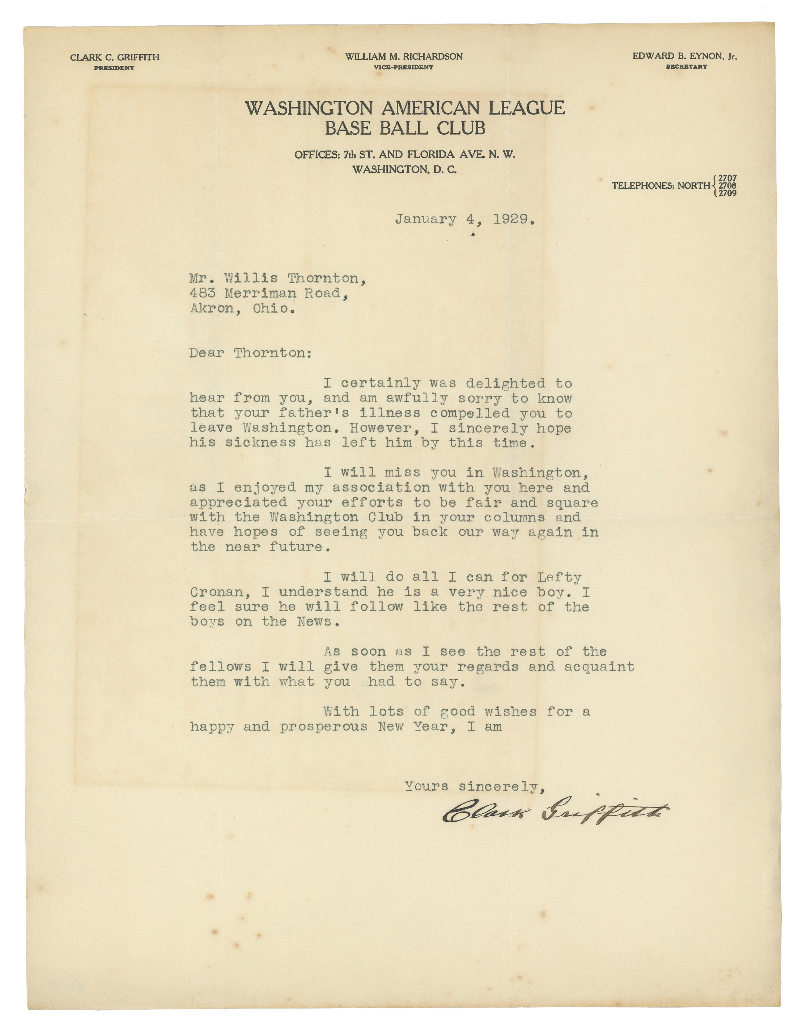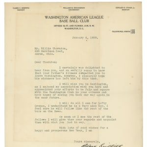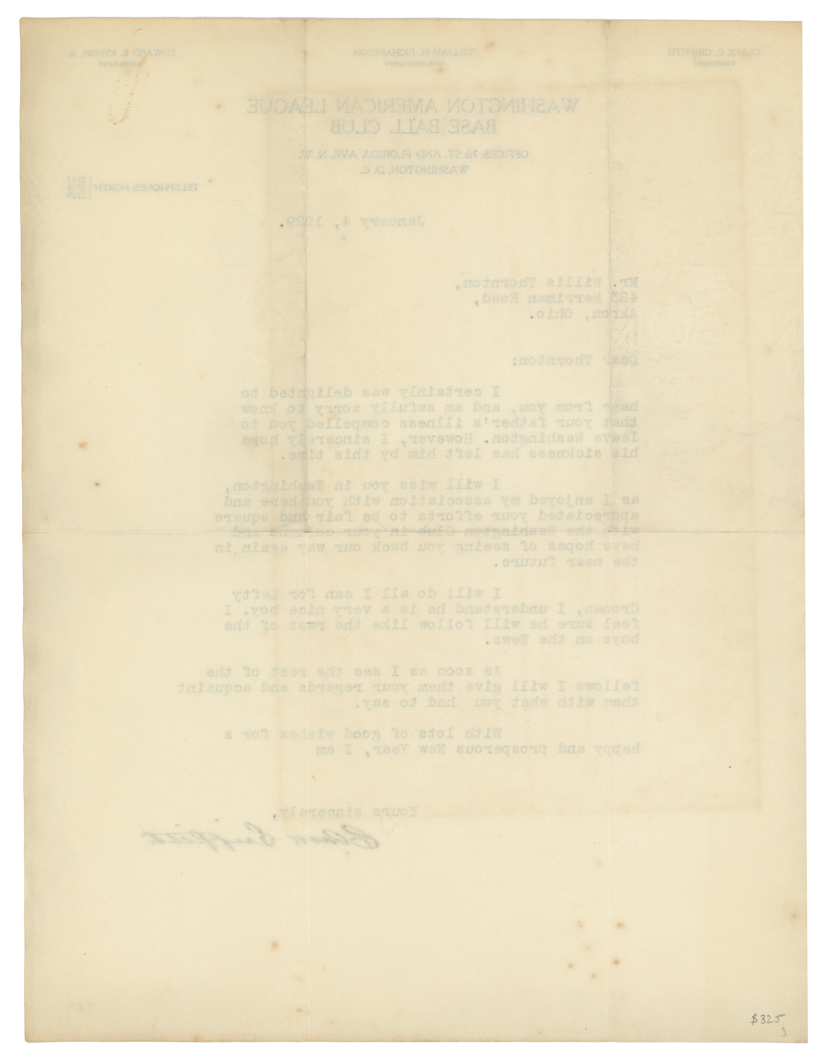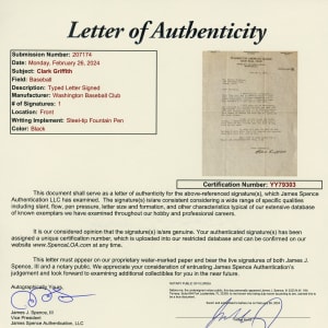 This Clark Griffith signed letter is notable for its exquisite calligraphy-style steel-tip fountain pen signature by the Hall of Fame executive (“9-10”). The type-written letter on “Washington Base Ball Club” letterhead is dated January 4th, 1929, and addressed to Mr. Willie Thornton of Akron, Ohio. The letter grades Very Good to Excellent with two folds, one which goes through the signature.