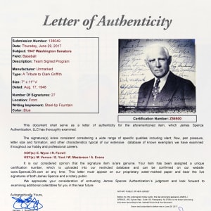 “A Tribute to Clark Griffith - Washington vs. New York - Tuesday, August 17th, 1948” proclaims the cover of this program to the event signed by (27) members of the Washington Senators with the image of their Hall of Fame executive, Clark Griffith, in the background.