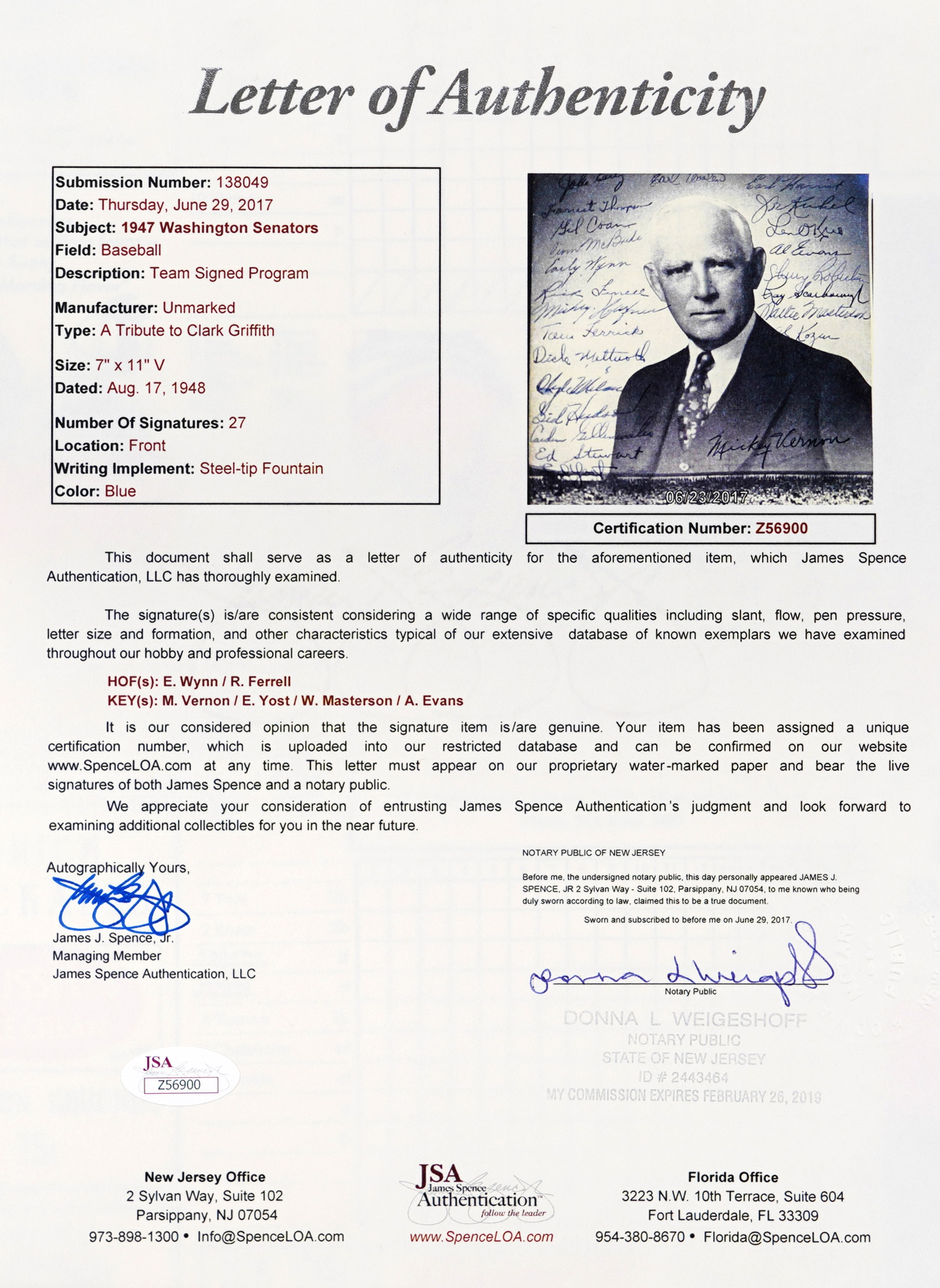 Full LOA from James Spence/JSA.