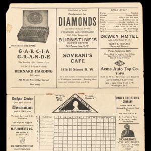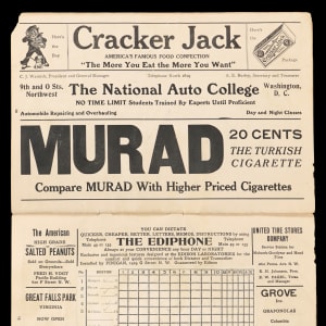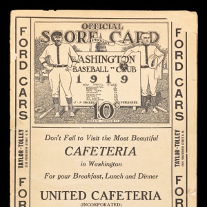 From Ruth's final season with the Red Sox, comes this 1919 scorecard. Issued for a game at National Park, with the Sox visiting the Washington Nationals, this antique gameday souvenir lists the "Bambino" as number 22 on the unused Red Sox scoring grid page. Limited to just seventeen games on the mound, Ruth saw more time in the outfield during the 1919 campaign, when he enjoyed a breakout season at the plate, setting a then astonishing MLB record of 29 home runs. He also led the AL in runs scored and RBI, while posting a 9-5 record in his fifteen pitching starts.
