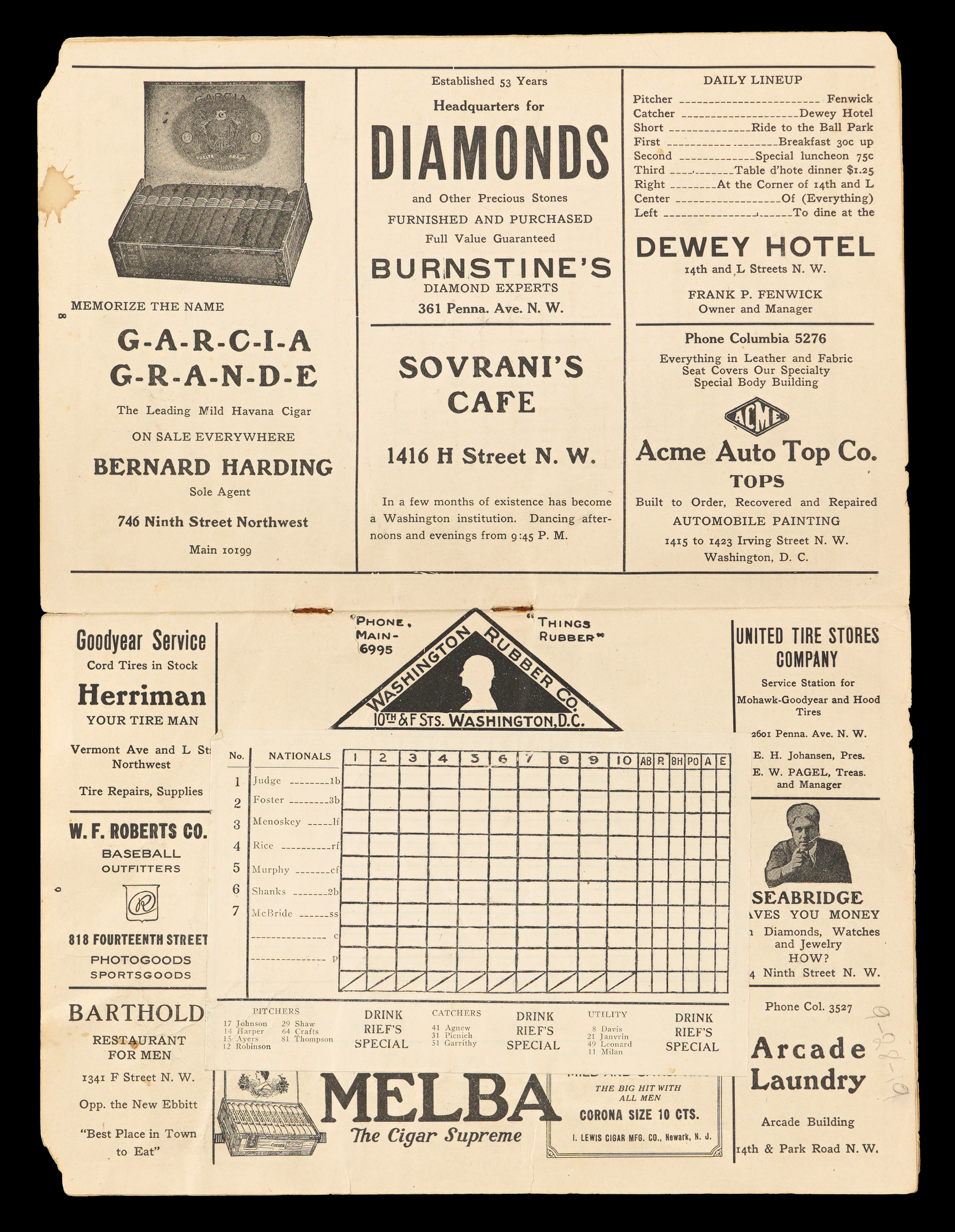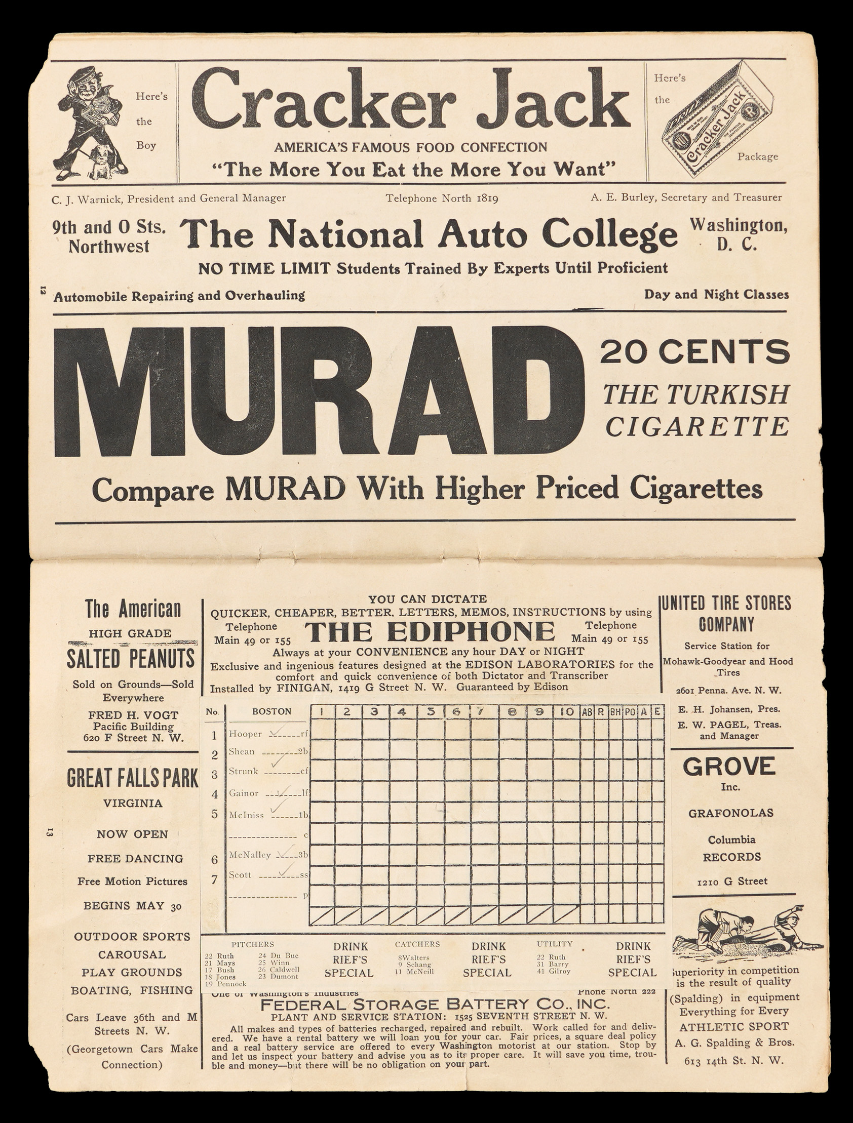 Despite reporting in FR-GD condition, this century-old scorecard remains reasonably attractive, with distinct graphics and text throughout. In addition to Ruth, the rosters list Hall of Famers Harry Hooper and Herb Pennock for the Red Sox, and Walter Johnson and Sam Rice for the Nationals. Other stars of note listed are Red Sox Otis Strunk, Wally Schang, "Stuffy" McInnis, Jack Barry, Joe Bush, "Sad Sam" Jones, and Carl Mays; and Nationals Joe Judge, Clyde Milan, and Val Picinich.