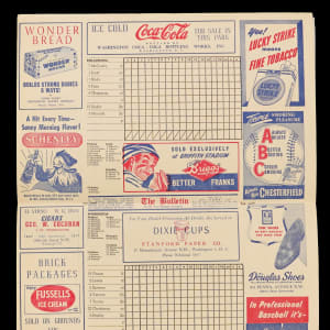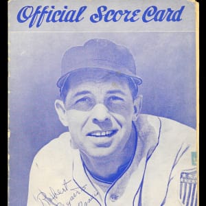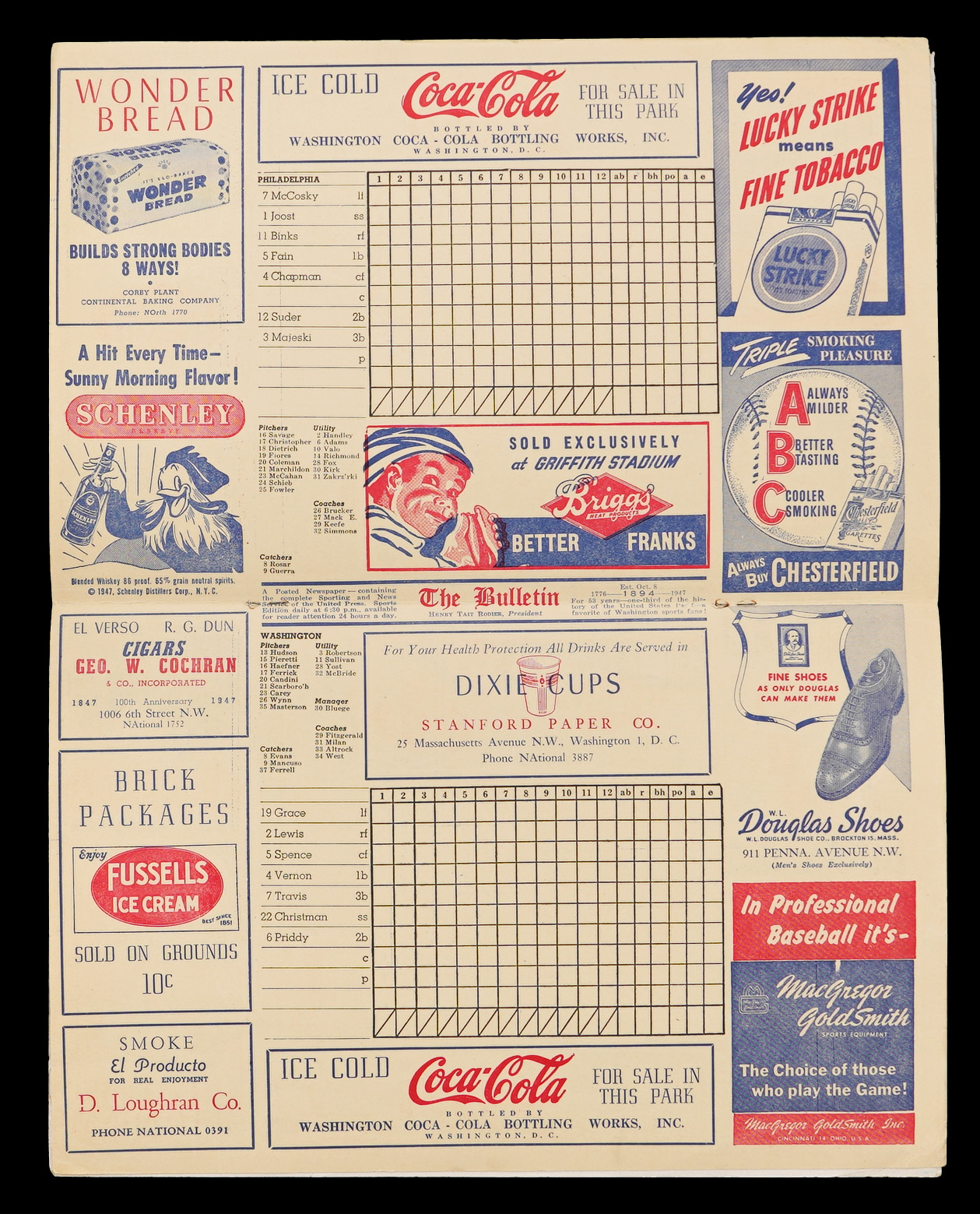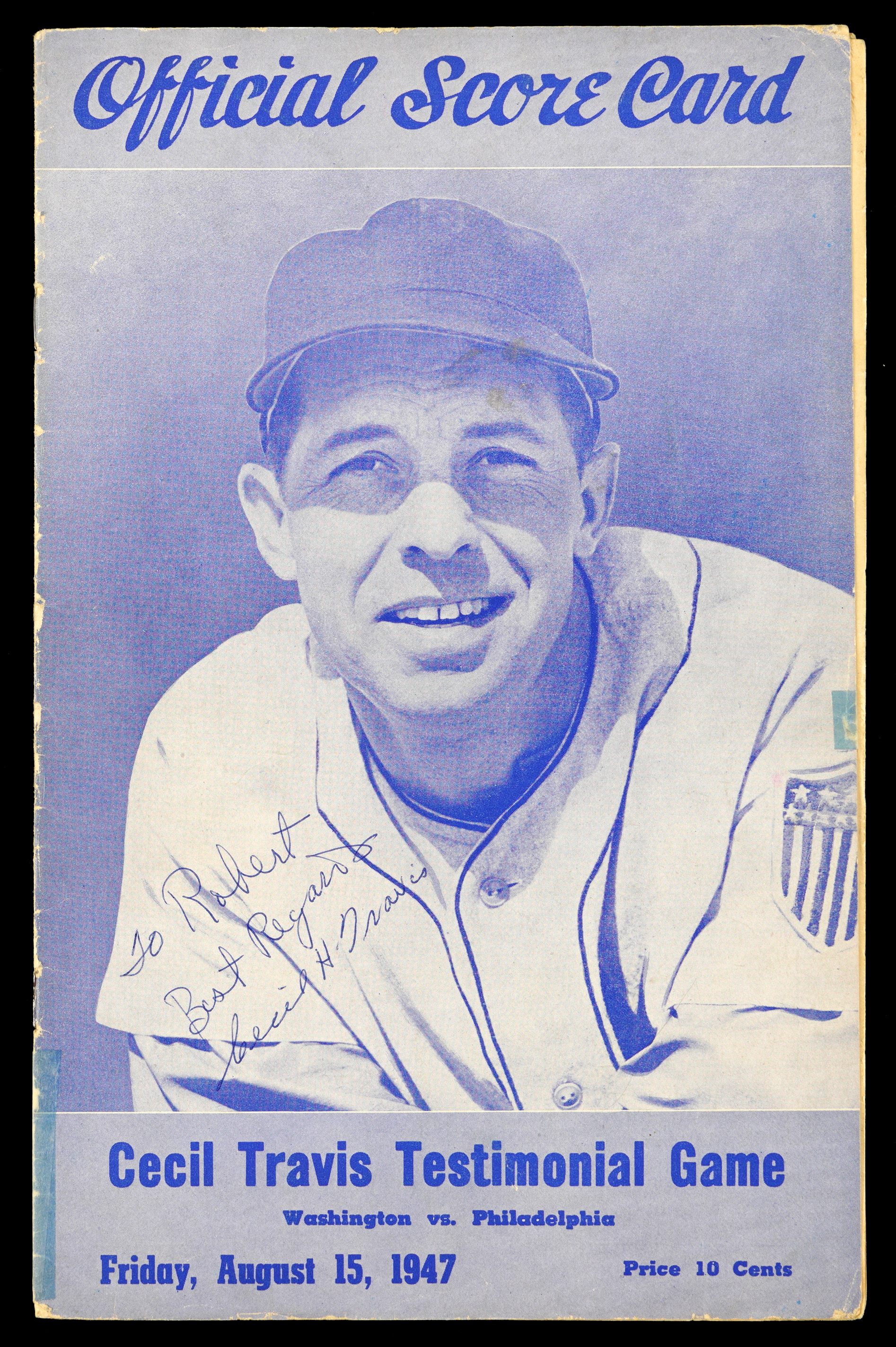 Washington Senators star shortstop/third baseman Cecil Travis was nearing the end of his productive career, when this Testimonial Game Official Scorecard was issued in his honor at Griffith Stadium. This gameday souvenir is dated August 15, 1947, for a Senators home game versus the Philadelphia Athletics. Travis has neatly signed and personalized the front cover at bottom right, in nice contrast against his jersey. While Travis was a career .314 hitter, he lost four years of playing time to WWII military service, costing him his shot at Hall of Fame enshrinement. The unused scorecard reports in VG condition.