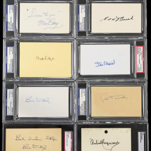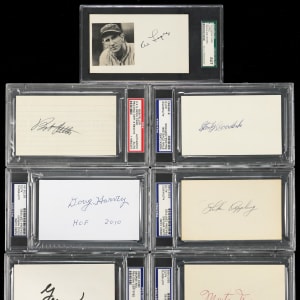 Haul in a nice catch of Hall of Famers, with this signed index card collection (17). The illustrious subjects have provided potent signatures, which are generally well-centered on vintage 3x5 cards. All are encapsulated by either PSA/DNA or SGC, with Authentic Autograph designations.