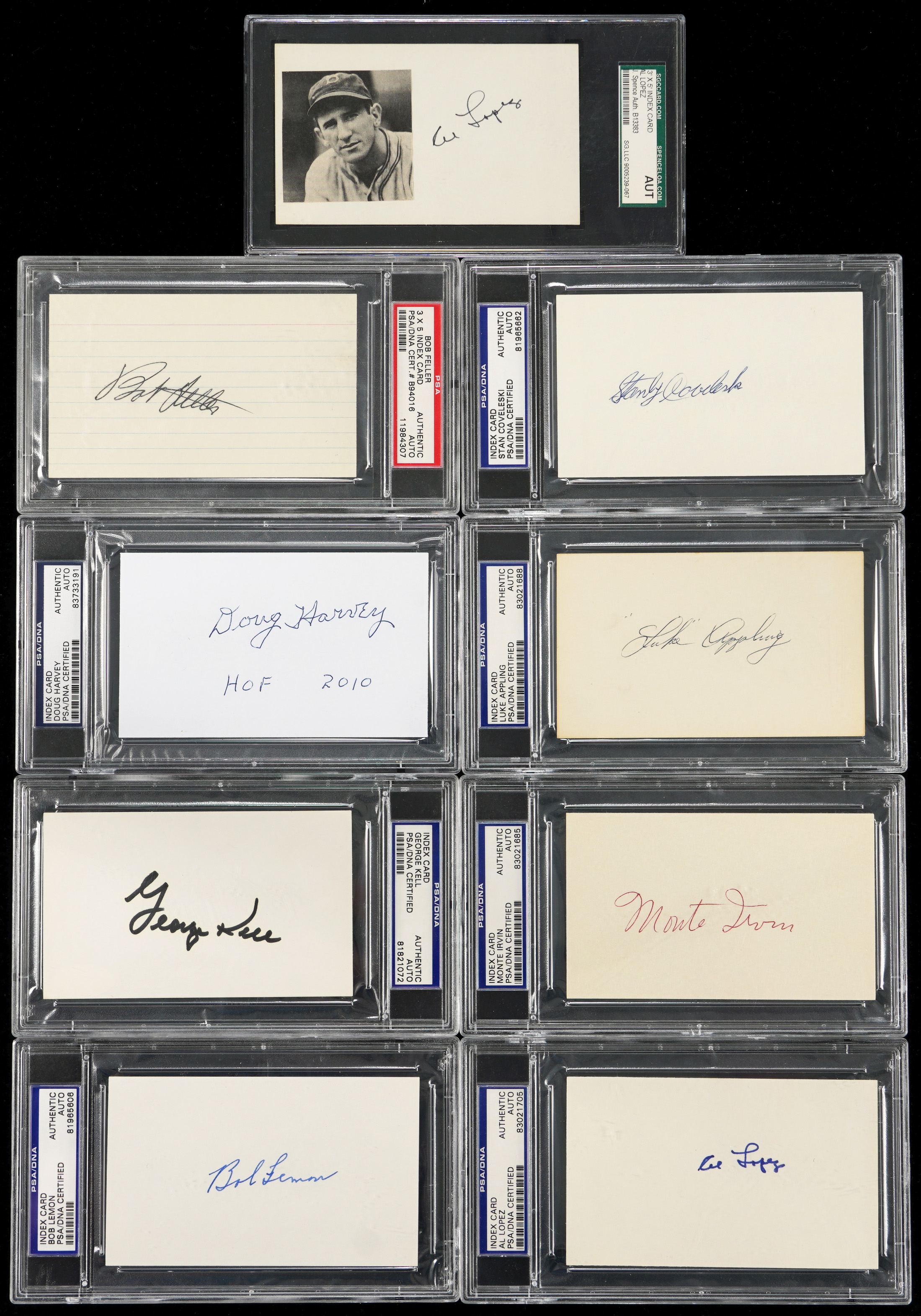 PSA/DNA certified signatures (14) are: Bill Dickey, Leo Durocher, Stan Musial, Max Carey (d.1976) with "Success to you", Edd Roush (d.1988), Waite Hoyt (d.1984), Doug Harvey with "HOF 2010", Luke Appling, Stanley Coveleski, Bob Feller, Monte Irvin, George Kell, Bob Lemon, Al Lopez.