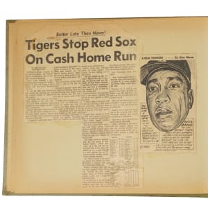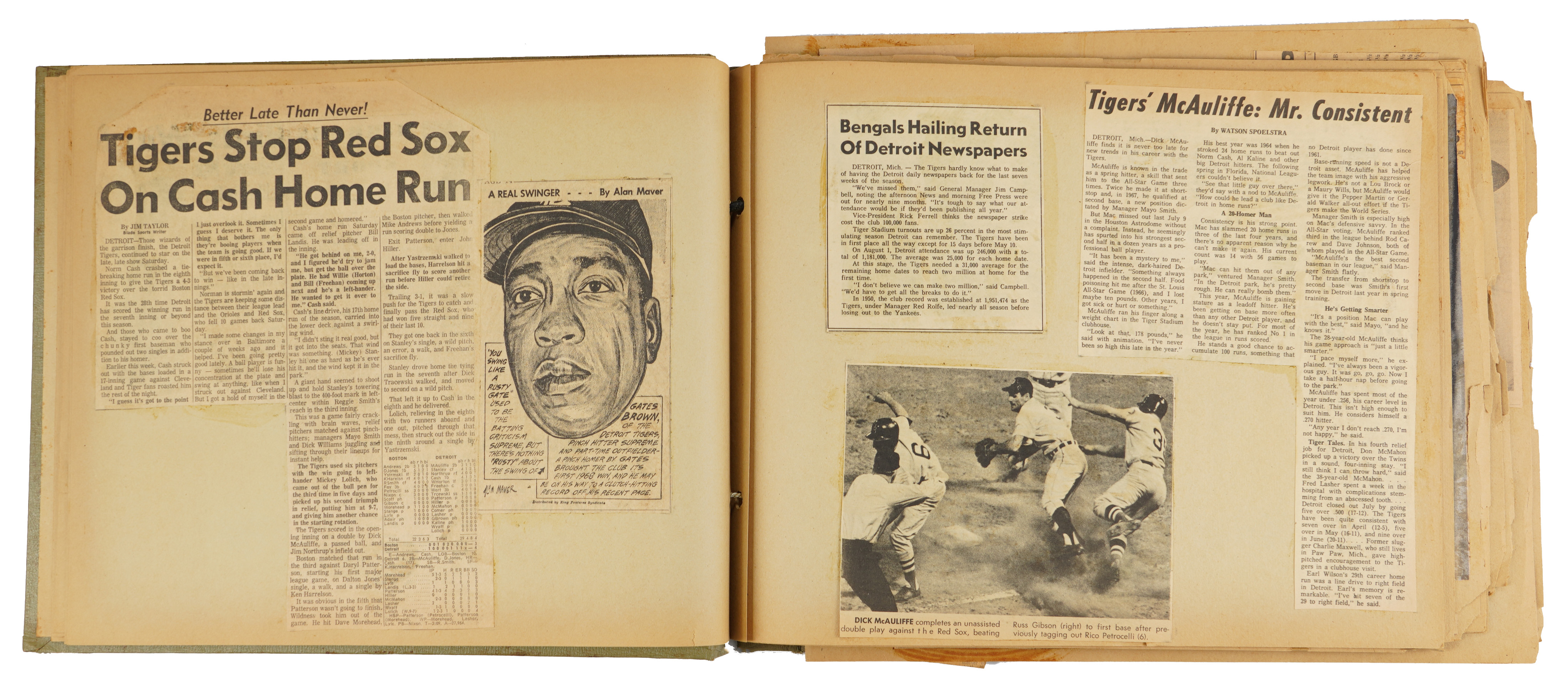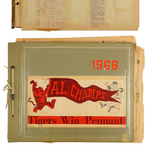 The 1968 Detroit Tigers were on a roll and it seemed like they were World Series-bound. Because they hadn’t been there since 1945, a dedicated fan wanted to document each step on the road to the championship, and he put together this 14x11 album that includes page after page of color and b/w photos, and newspaper articles from their season. Al Kaline, Eddie Mathews, Willie Horton, Mickey Lolich, Bill Freehan and Norm Cash are all here. At least half of the slightly brittle pages have come loose from the album.