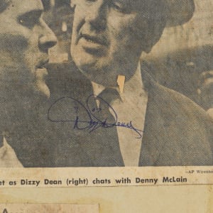 Of course, the highlight of the season was something no pitcher had done since Dizzy Dean did it in 1934, a 30-win season. One of the pages features the Sports Illustrated cover with Denny McLain’s win number 30. Adjacent in the scrapbook is a photo of McLain meeting the great Dizzy Dean after the game. Hall of Famer “Diz” has applied a ballpoint signature (“8-9”) on his photo with the record-breaking pitcher. No pitcher has done it since, and no one likely will.