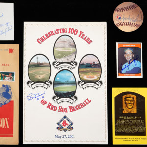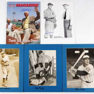 Bobby Doerr (4 items) - 1947 Red Sox program/scorecard (VG-EX), “100 Years of Red Sox Baseball” large color brochure, Boston Red Sox Magazine (2 different).