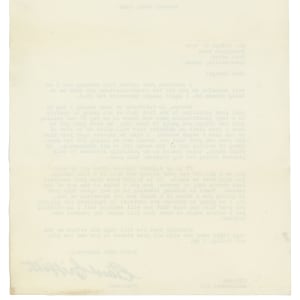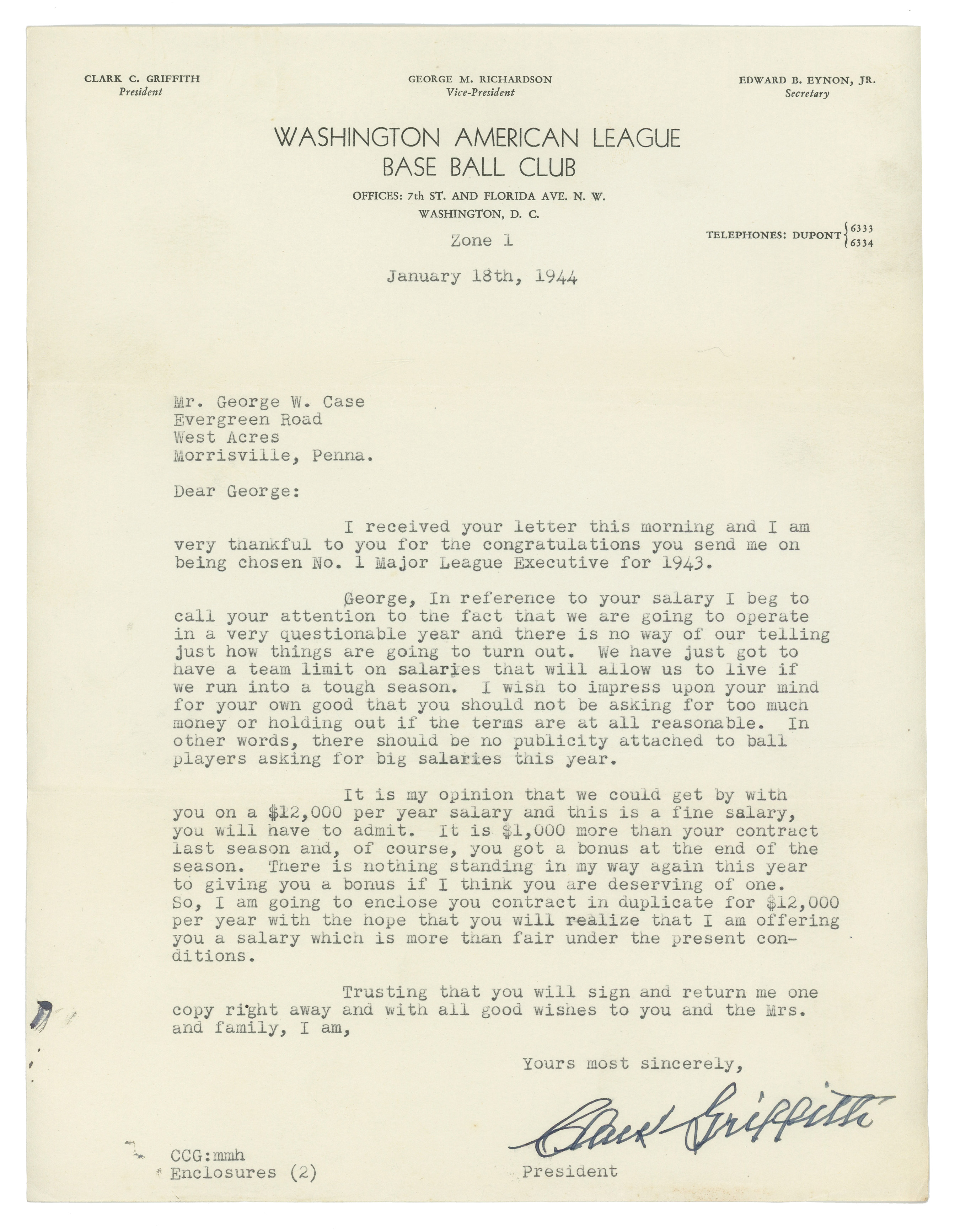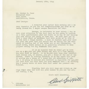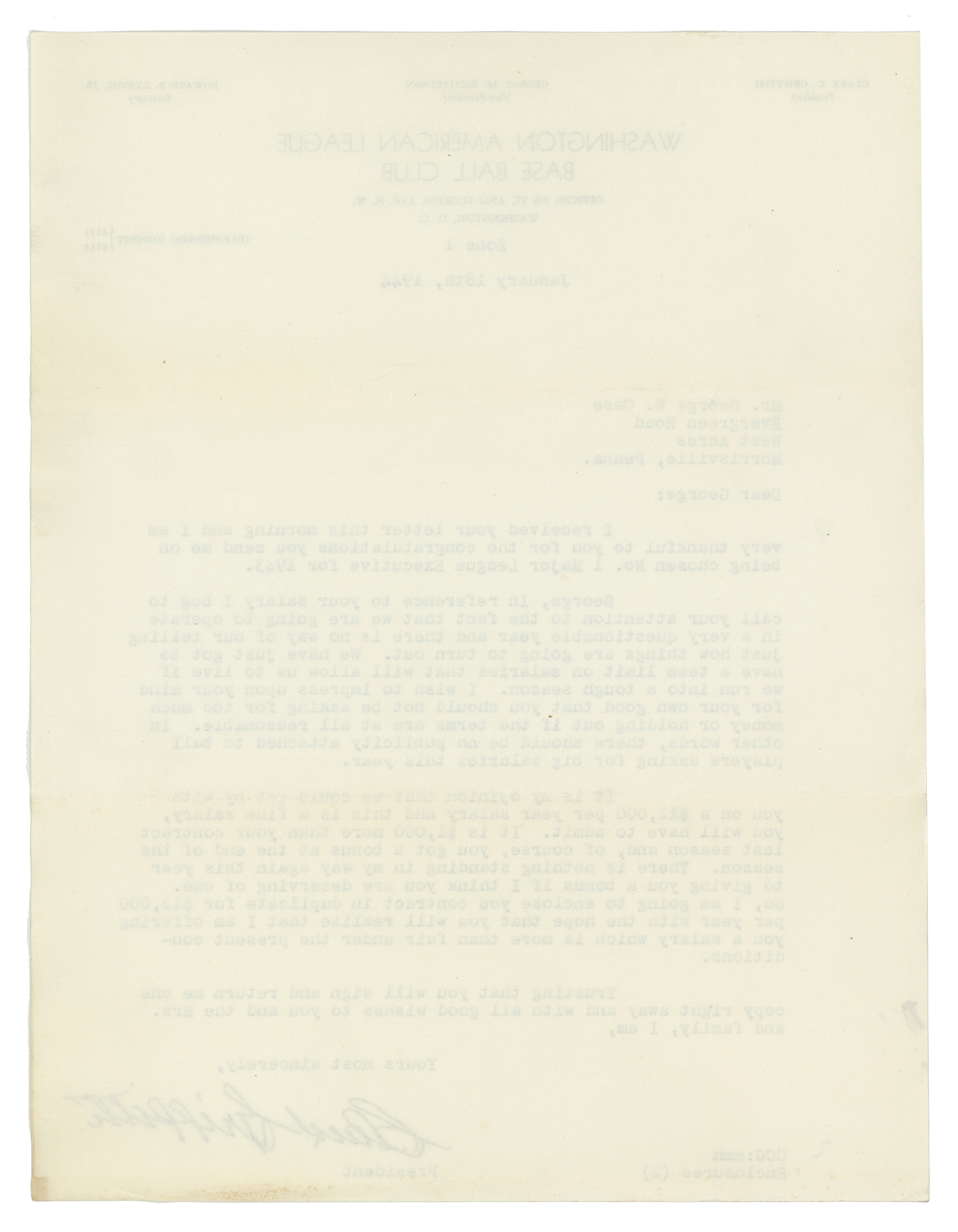 Hall of Fame executive, Clark Griffith, has signed this letter on “Washington American League Base Ball Club” stationery, a dark (“9”) signature. Dated January 18th, 1944, it is addressed to outfielder George W. Case of Morrisville, Penna., thanking Case for congratulating him for becoming Major League Executive for 1943. Griffith went on to explain to Case that he can’t raise his salary as he expects a bad year for the Washington Nationals. They finished in 9th place that year with Case hitting .250.