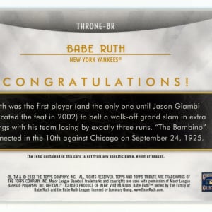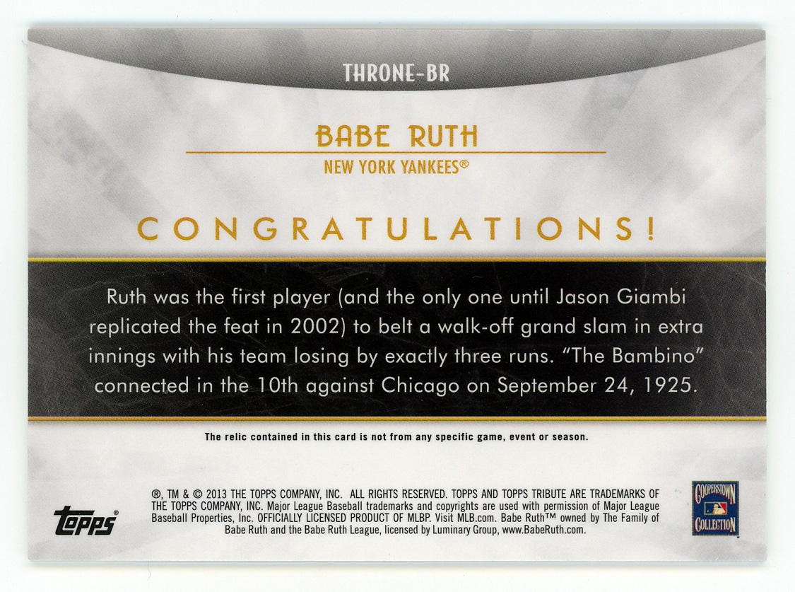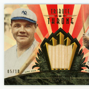 Crown your modern insert collection with the offered 2013 Topps Tribute to the Throne Babe Ruth relic card. Serially numbered #5/10, this wood relic featuring "The Colossus of Clout" is a red parallel variant. A top-shelf example of the "larger than life" New York Yankees Hall of Fame legend.