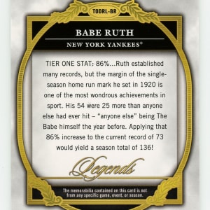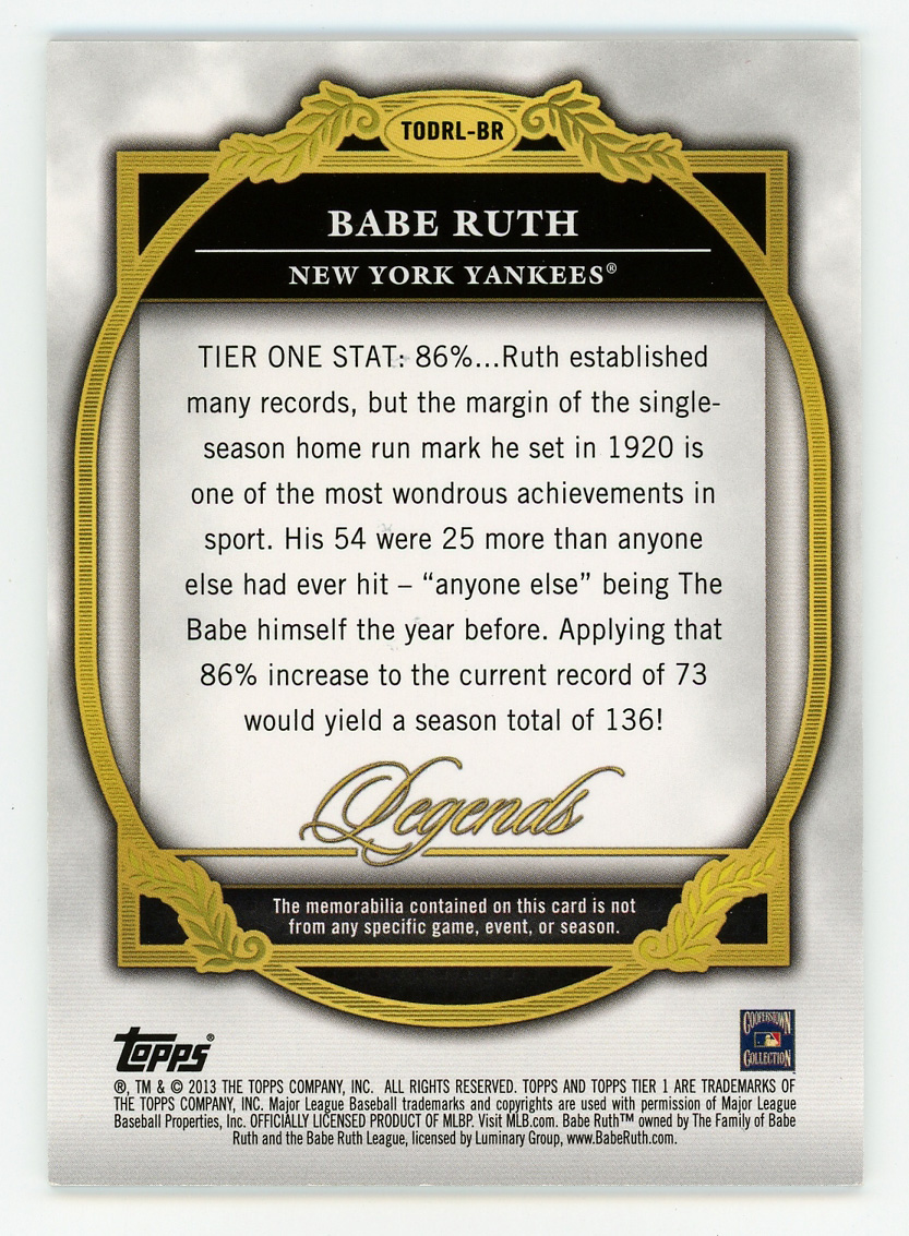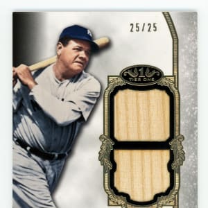 Serially numbered #25/25. The mighty Babe Ruth swings away on this majestic 2013 Topps Tier One Double Relic Legends card. Imagine the thrill the original owner had when pulling this "Bambino!" New York Yankees Hall of Famer.
