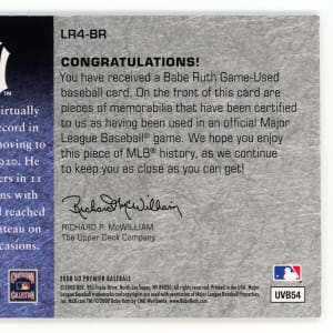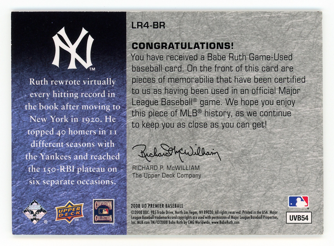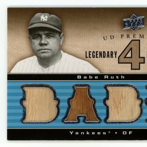 The Sultan of Swat! Serially numbered #1/10. Impressive 2008 UD Premier Babe Ruth game-used bat card. This "Legendary Remnants" parallel features four slices of Ruthian lumber embedded in a "Babe" design scheme. One of the more desirable cards of the New York Yankees Hall of Fame slugger seeded across the production line.