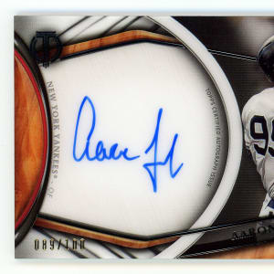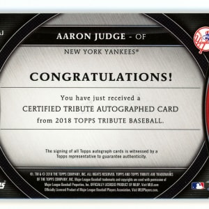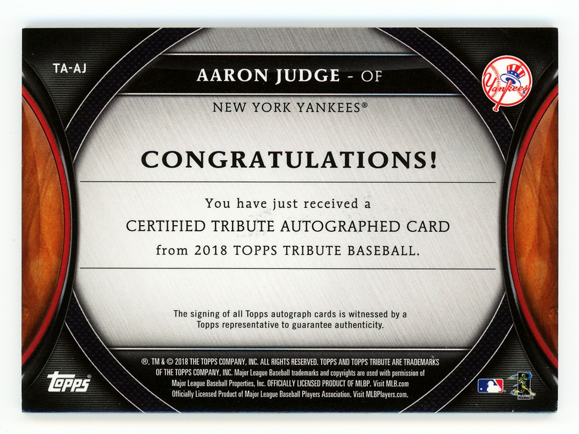 Serially numbered #89/100. New York Yankees superstar slugger Aaron Judge puts pen to canvas on the offered 2018 Topps Tribute certified autograph modern insert. Away jersey pose variant.