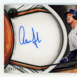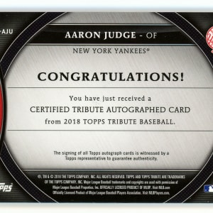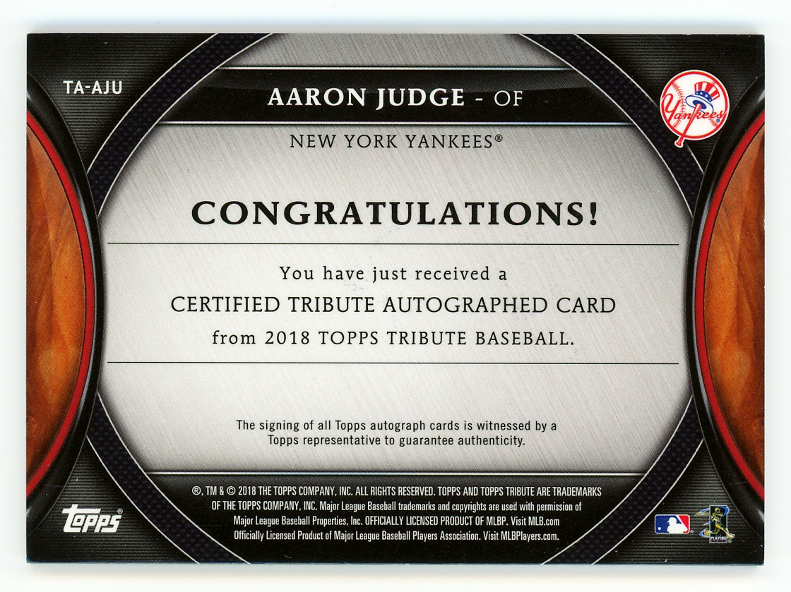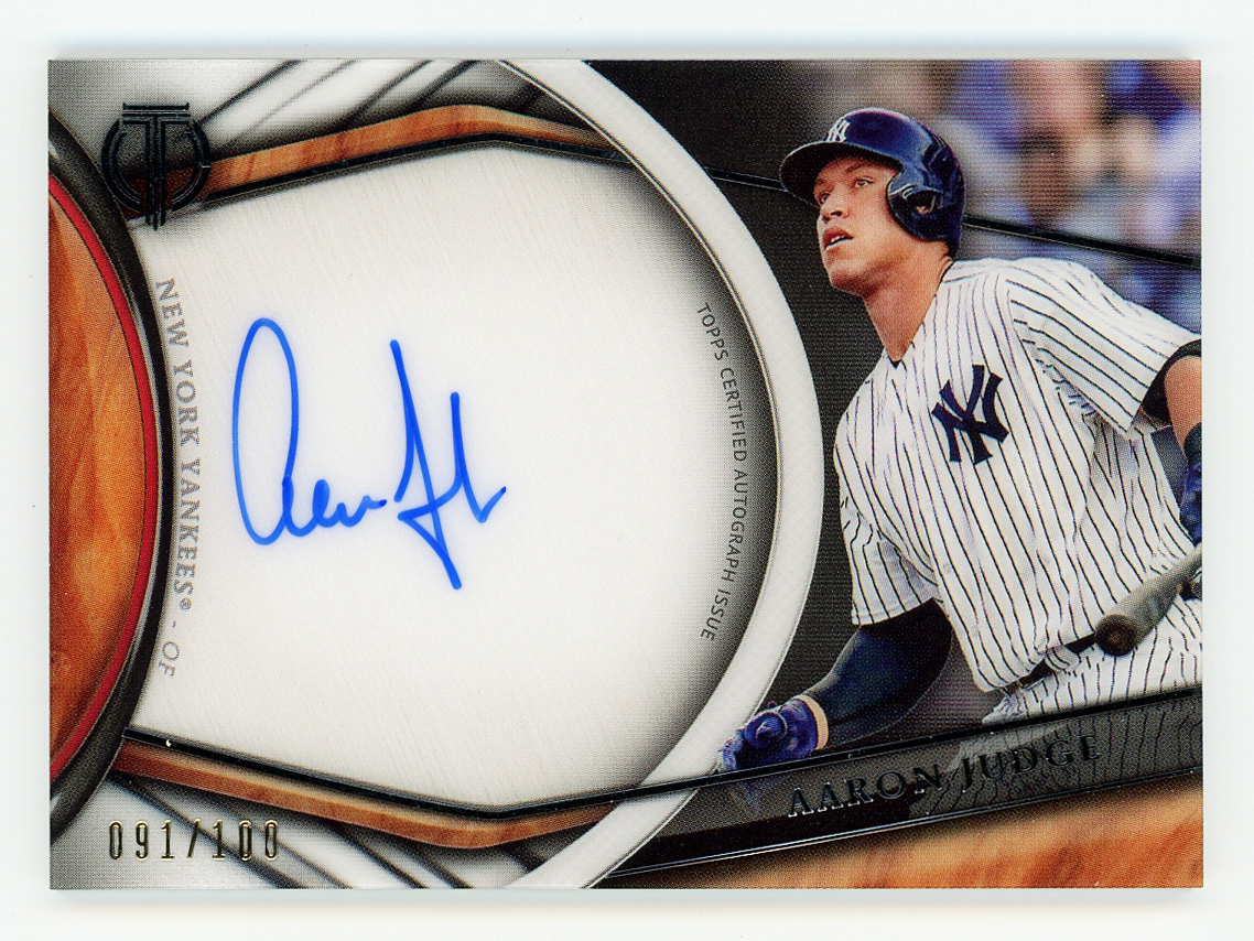 Serially numbered #091/100. Cooperstown is the inevitable future for New York Yankees Hall of Fame slugger Aaron Judge. The hulking #99 goes deep on the offered 2018 Topps Tribute certified autograph modern insert. This "on card" autograph is captured on a home jersey variant.