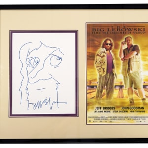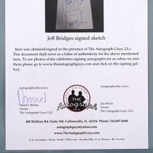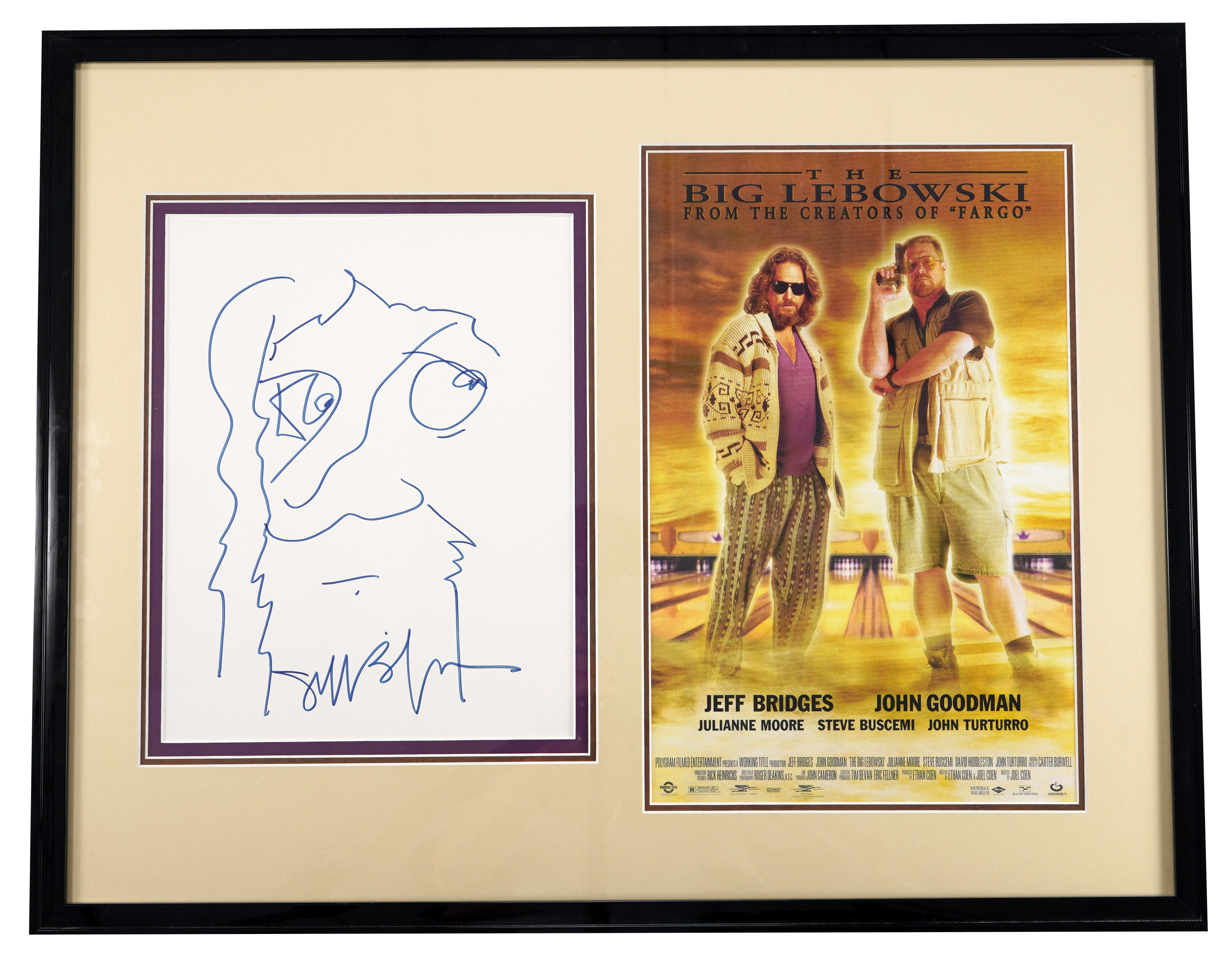“The Dude abides”. If you know, you know, and this Big Lebowski display is certainly for you. Released in 1998, the film “The Big Lebowski” is a cult classic, that holds up after repeated viewing. Lead actor Jeff Bridges made this display a keeper, thanks to a signed self-portrait sketch in character as the “Dude”. Seen in a visible window of 10” x 13”, Bridges signature and sketch are bold and stylish. Joined with the signed sketch in this 23” x 29” framed display, is an 11” x 17” poster touting the namesake movie. Pictured in this poster are Bridges as cool slacker Jeffrey “The Dude” Lebowski, and John Goodman as his overbearing bowling buddy, Walter Sobchak. All elements of this professional display present in excellent condition.