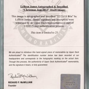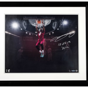 Season’s Greetings from LeBron James! Served up is a James signed and inscribed Christmas Day Dunk photograph, in framed display. Professionally framed and matted to overall dimensions of 27” x 23”, this limited-edition 16” x 20” photograph is numbered “1/25” at the bottom right corner. James is lit in dynamic effect, so that his Miami Heat Christmas red uniform stands out nicely against a darkened arena. James has signed boldly at right by means of a silver felt-tip pen, with the inscription “12-25-13 Win”, and all elements of this piece present handsomely. Presented just in time for the coming holiday season, this one is going to make an avid basketball fan very happy.