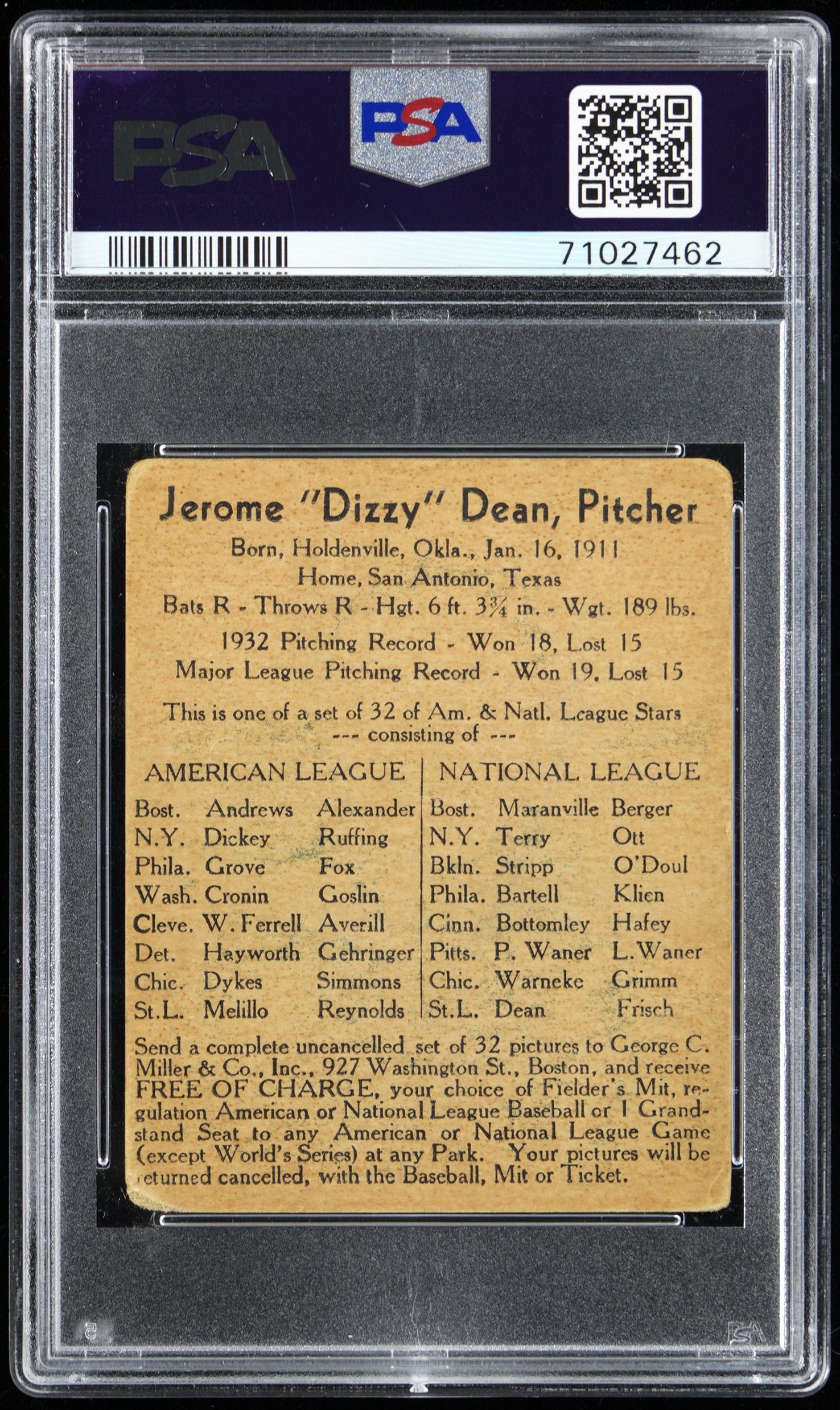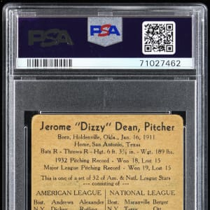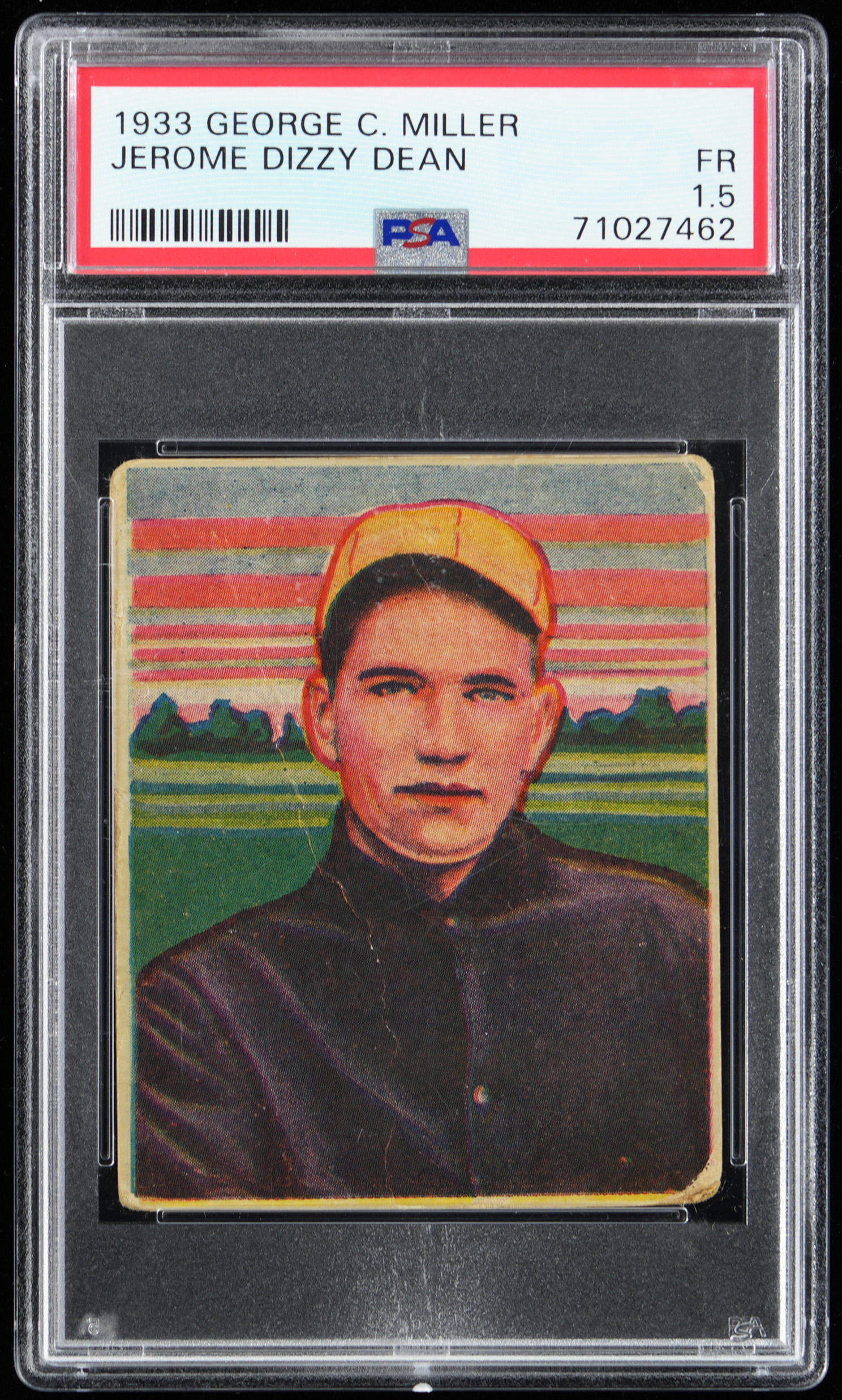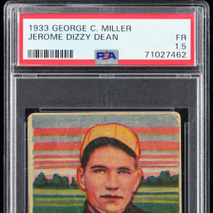 Graded FAIR 1.5 by PSA. As one of the most colorful figures in the history of our national pastime, Jerome (Dizzy) Dean is again candidly portrayed during his playing days on the offered 1933 George C. Miller Type card. While the St. Louis Cardinals ace and Gashouse Gang alum has sustained moderate handling and a surface crease from an earlier admirer, the splashy art deco design sequencing of this Boston-based issue overwhelms any technical detractors. A complete, uncancelled pre-war Hall of Famer from one of the 1930s most obscure and desirable gum card issues. Clean and unmarked Type 1 advertising back.