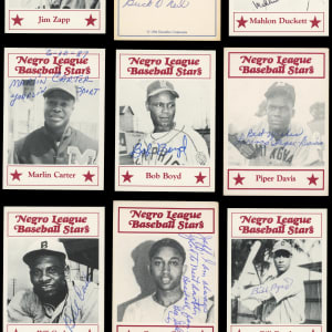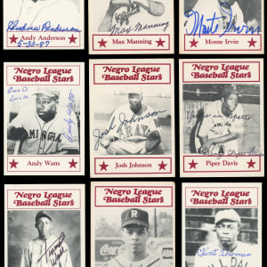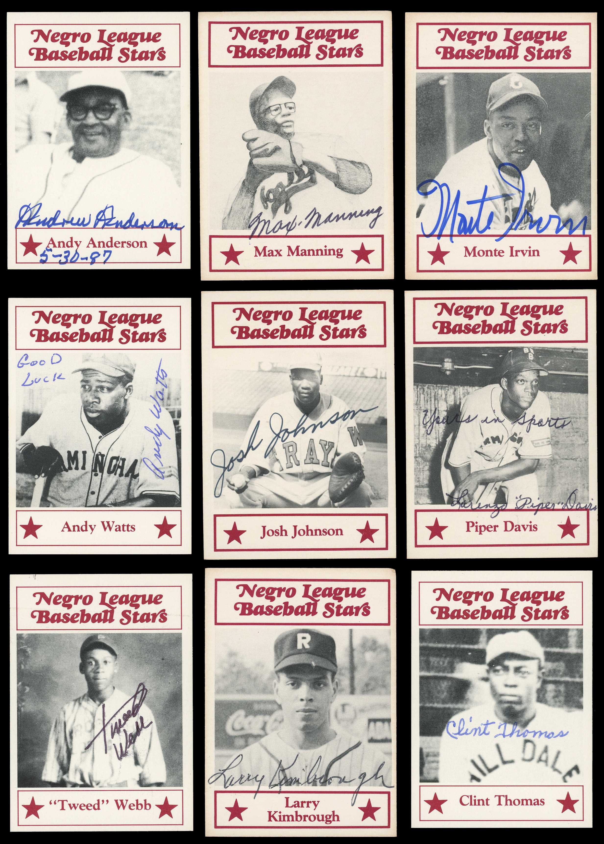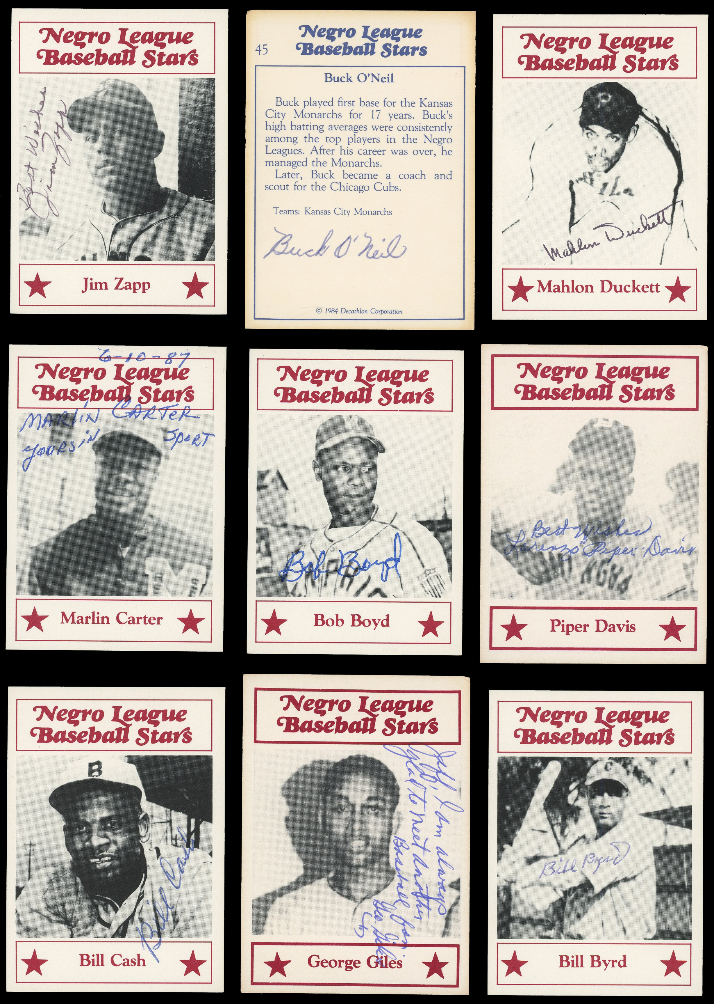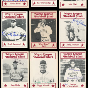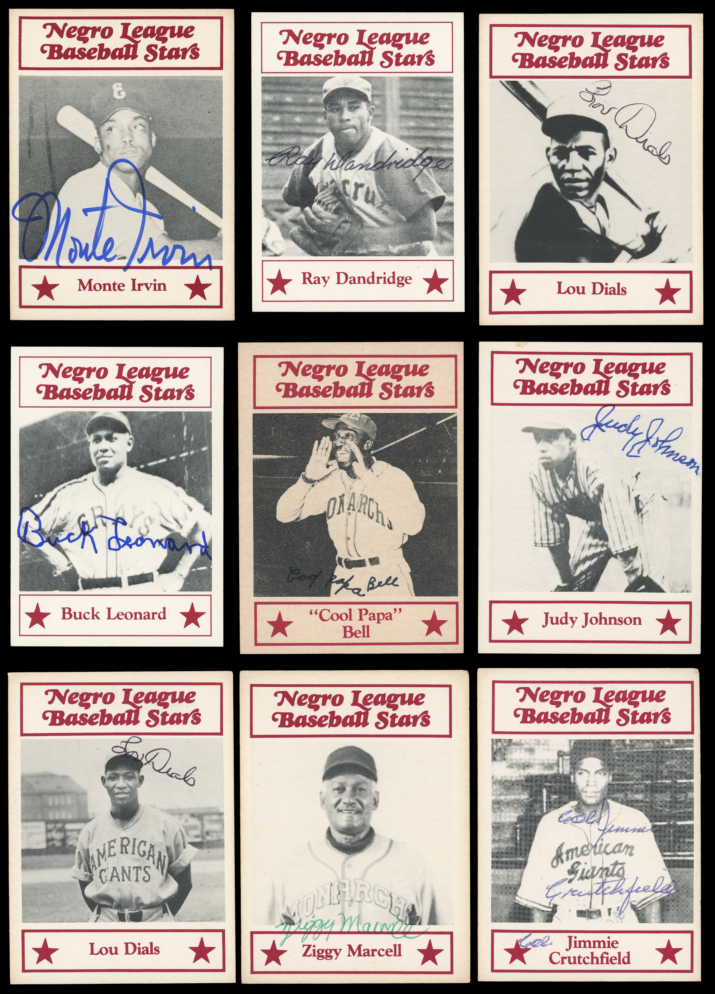 Legendary ballplayers barred through a “gentleman’s agreement” are proudly admitted to the offered 1984-1986 Decathlon Negro League Baseball Stars near complete set of (118/119) cards with (33) autographed. The unsigned 1986 cards average (NM-MT) while the signed examples are a mix of the 1984 & 1986 examples which differ slightly in dimensions. The average (“9”) signatures are placed on mostly (EX to EX-MT) surfaces. Additionally, several players added interesting inscriptions and other career/life notations. Signatories include: #1 Leonard, #5 Ju. Johnson, #6 Irvin, #7 Dandridge, #12 P. Davis, #13 Jo. Johnson, #14 Dials, #17 Watts, #20 Dials, #29 Crutchfield, #33 C. Thomas, #37 Kimbrough, #39 Webb, #40 Duckett, #41 A. Anderson, #45 O’Neil (signed on back), #46 Zapp, #47 P. Davis, #49 Boyd, #50 M. Carter, #51 Giles, #52 Byrd, #53 Pennington, #54 Manning, #55 Teasley, #56 Marcell, #57 Cash, #60 Thurman, #61 Kimbrough, #62 Mathis, #63 Jo. Johnson, #89 Irvin and #90 Bell. An extra unsigned #90 Cool Papa Bell (NM-MT) is also included. Auction LOA from James Spence/JSA.