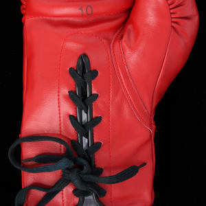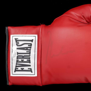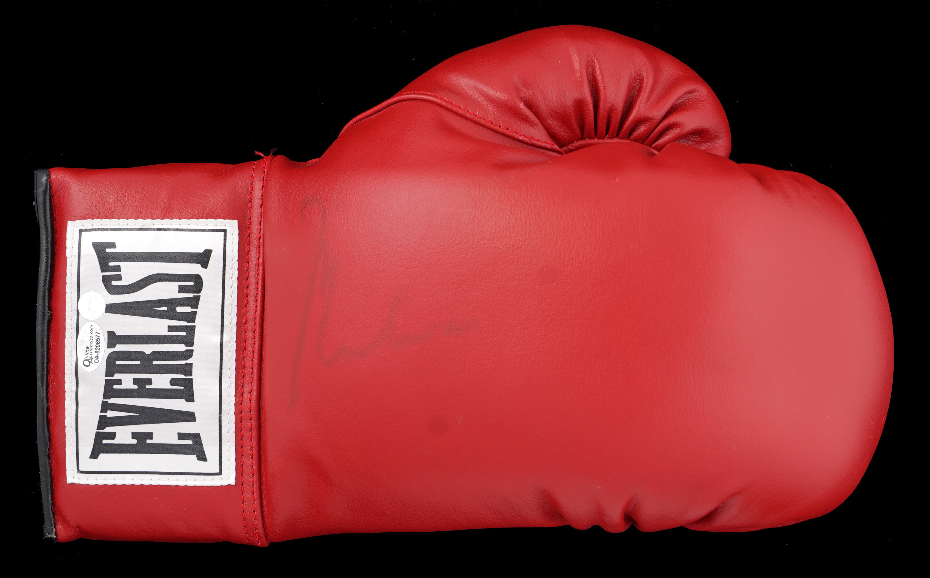 Punch up your autograph collection, with this Muhammad Ali signed Everlast boxing glove. Known far and wide as "The Greatest", Ali typically provided fans with tight, little signatures. In this case he super-sized it, and though his signature on this like-new glove has faded over the years, it is still easily recognized, thanks to the majestic proportions of this jumbo signing. Steiner COA/sticker, and Online Authentics sticker.