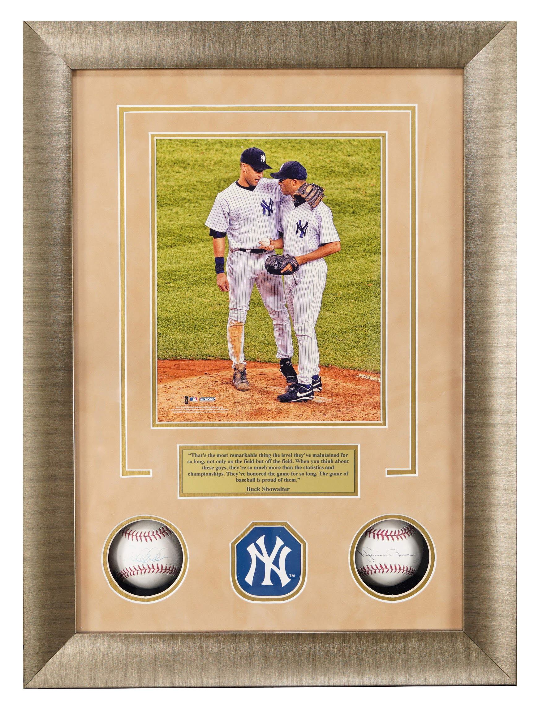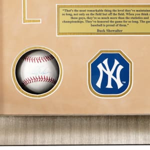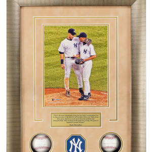 The better half of the “Core Four” is spotlighted, with this display housing Derek Jeter and Mariano single-signed baseballs. The “Captain” and the "Sandman” led the New York Yankees to five World Series championships, and they were also teammates on many AL All-Star squads. In historical context, Rivera is the only Hall of Famer to date to have earned 100% of the BBWAA votes, and Jeter has the second best election tally with 99.7%, the highest total ever for a position player. Sized at 17” x 23”, this 4” deep shadowbox display is a tasteful presentation, in excellent condition. Five windows showcase an 8” x 10” photograph of the high profile subjects, a brass title plate, a Yankees logo, and the two single-signed baseballs. Both sweet spot signatures are appealing applications.