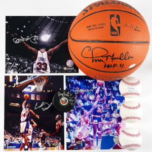 SIGNED BASKETBALL: Chris Mullin (“9-10”) with “HOF 11” inscription.