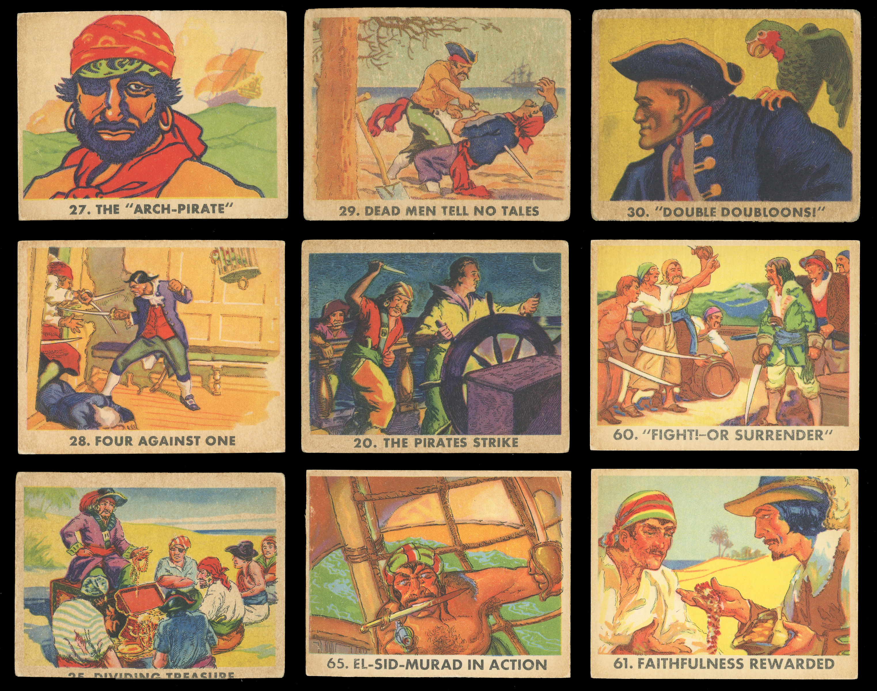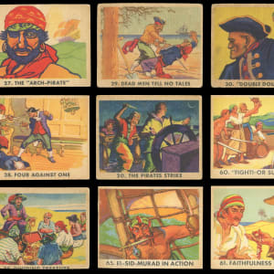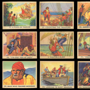 Follow the daring exploits of history’s most notorious seafarers, with this selection of (41) 1936 R109 Gum Inc. Pirate's Picture Bubble Gum cards. A collector favorite released ninety years ago, this colorful series relates tales of real-life pirates, through classic artwork and riveting narratives. The most prominent sea raiders detailed in these accounts are Edward "Blackbeard" Teach, Captain Kidd, Bartholemew "Black Bart" Roberts, and Charles Vane.
