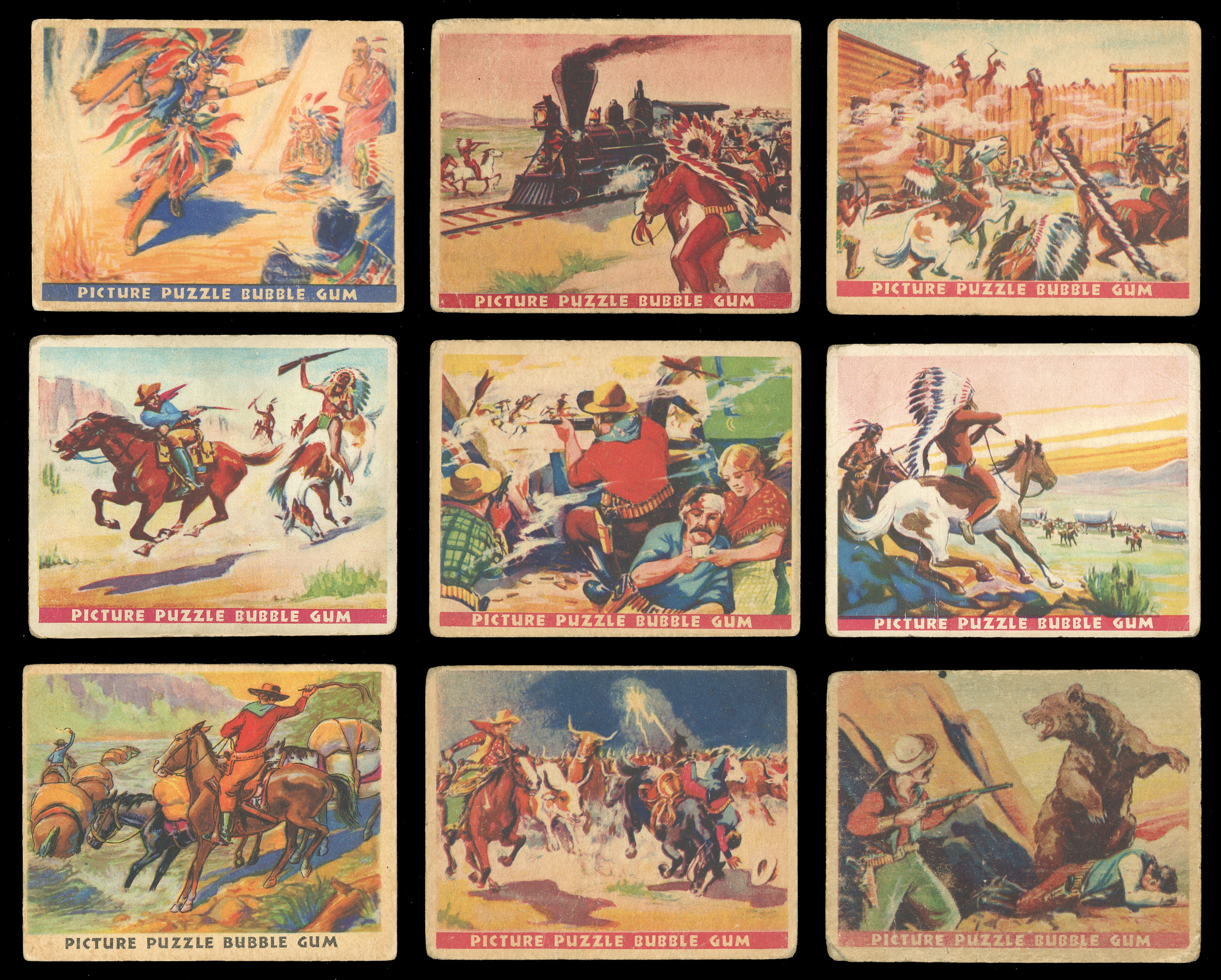 Card number 25 is a rare premium offer for a cowboy outfit, and is not considered part of the set, so this offering is complete with a total of (48) cards. Series A is comprised with card numbers 1-24, which have a red stripe on the bottom border of the obverse, and puzzle backs. Series B is comprised of card numbers 26-49, which were issued with either a blue stripe on the obverse, and puzzle backs, or plain obverse bottom borders, without puzzle lines on the back.