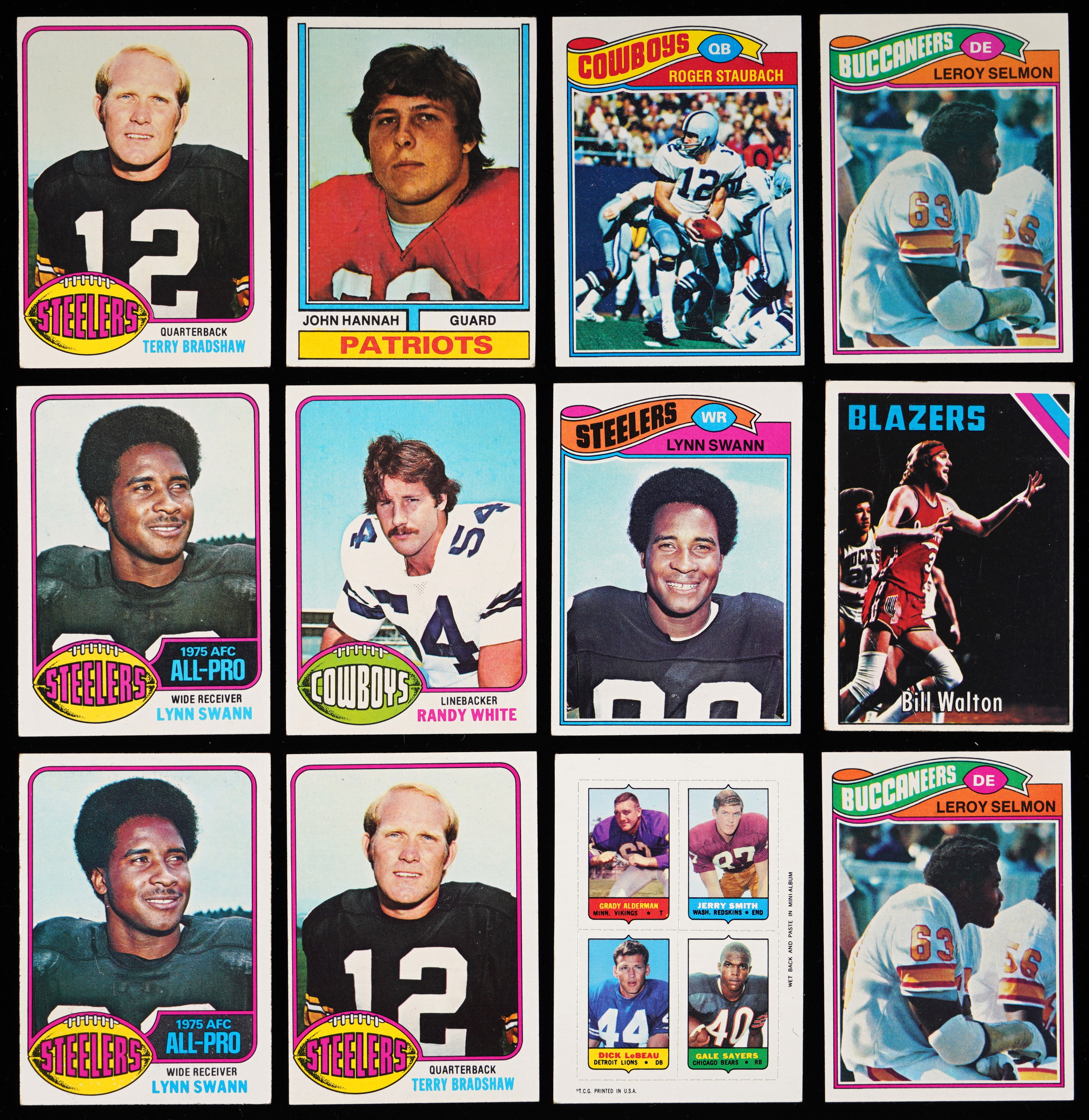 1976 Topps: (156 cards, average EX to EX-MT) with (2) #75 Bradshaw (VG-EX, VG), (2) #148 Swann (EX-MT, VG), #158 R. White RC (VG), #220 Lambert RC (VG-EX), #395 Staubach (EX-MT);