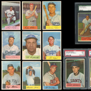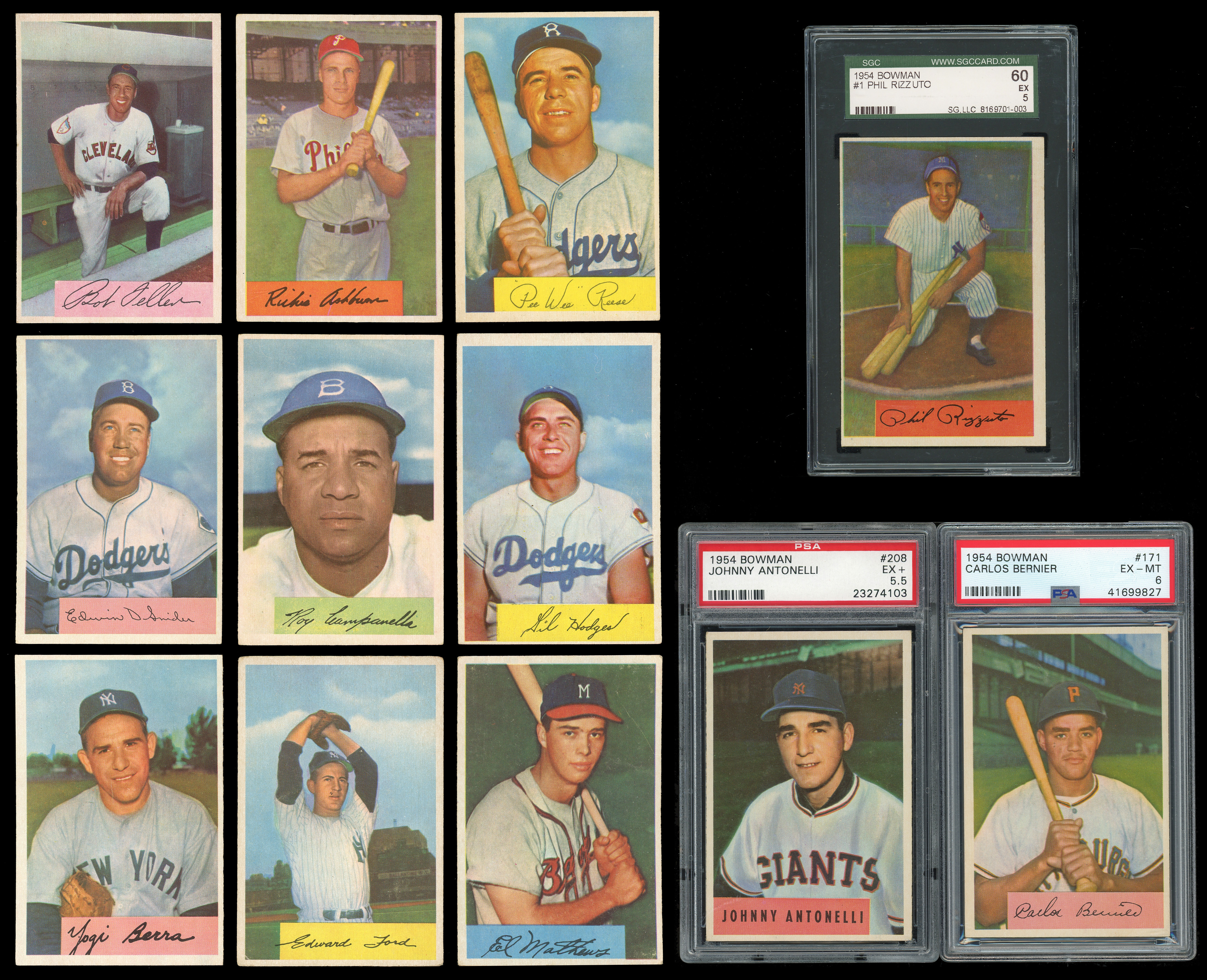 Formidable 1954 Bowman near complete set of (222/224) cards. This second-to-last diamond edition from the Philadelphia-based firm has an overall approximate condition breakdown of 20% (EX-MT or better), 35% (EX), 25% (VG-EX) and 20% (VG or lesser). Highlights include: #1 Rizzuto (SGC EX 5), #6 Fox (VG), #15 Ashburn (VG-EX), #45 Kiner (EX-MT), #50 Kell (VG), #57 Wilhelm (EX-MT), #58 Reese (EX), #62 Slaughter (VG-EX), #64 Mathews (GD), #66 Piersall (EX), #84 Doby (VG), #90 Campanella (VG-EX), #95 Roberts (VG), #101 Larsen RC (EX), #110 Schoendienst (VG-EX), #132 Feller (EX-MT), #138 Hodges (VG-EX), #145 B. Martin (VG-EX), #161 Berra (EX), #164 Wynn (VG), #170 Snider (VG-EX), 171 (PSA EX-MT 6), #177 Ford (GD), #196 Lemon (VG, stain), 208 (PSA EX+ 5.5) and #224 Bruton (EX). Missing only #65 Mantle and #89 Mays (available elsewhere in this auction as separate lots) for completion.