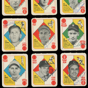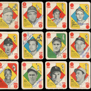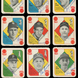 Other Signed: (35 cards) with #3, #6 Reynolds, 9-11, #12 J. Hegan (d.1984), 13, 14, #16 Roe, 18, #19 Kokos (d.1986), #20 D. DiMaggio, 21, 23, #24 Bauer, 25, #26 Easter (d.1979), 27-29, 33, 34, #35 Rosen, 36, 37, #39 Kluszewski (d.1988), #40 Garcia (d.1986), 41, 42, 44-46, 49, 51, #52 Holmes (Boston in Bio);