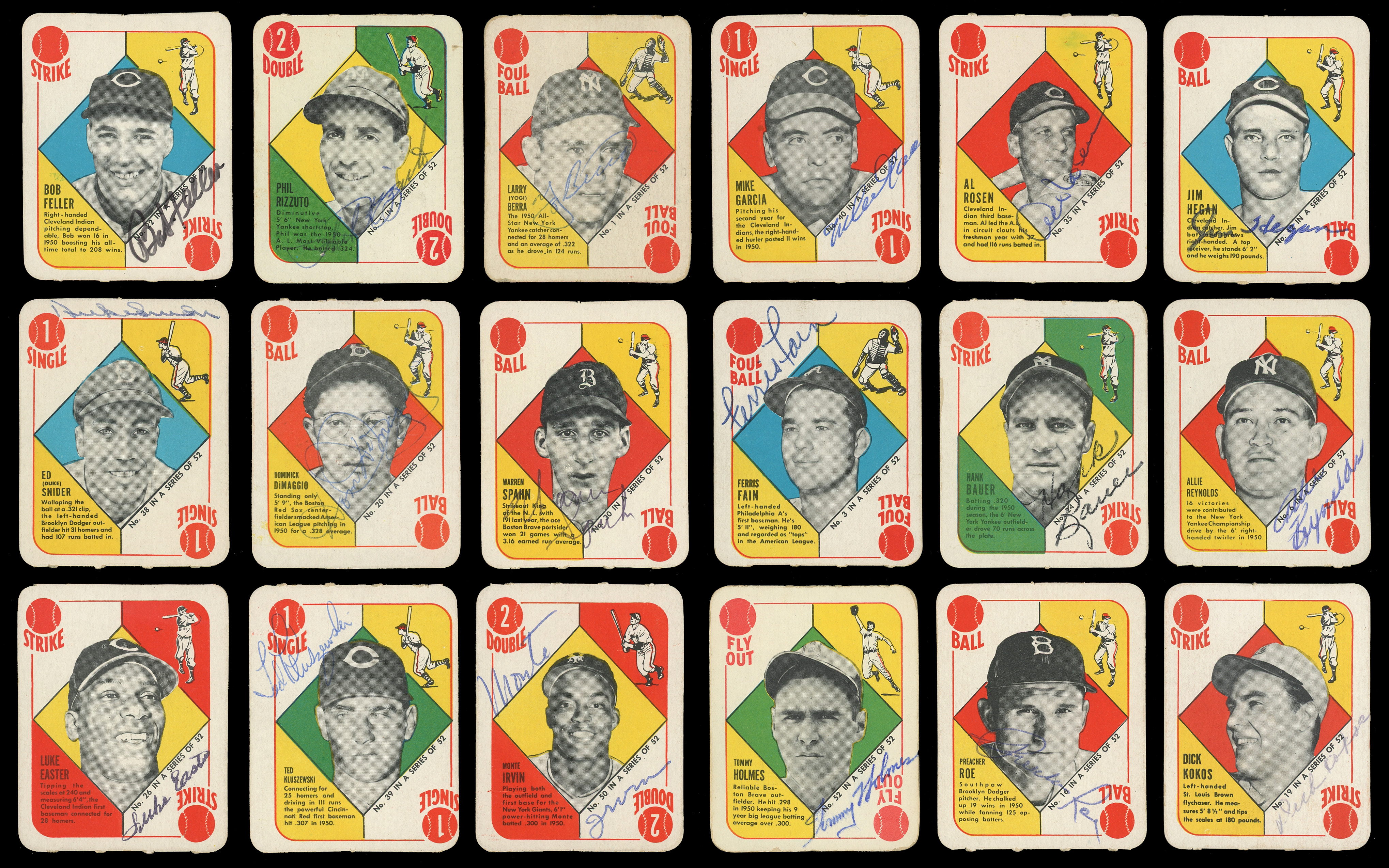 Hall of Fame Signed: (6 cards) with #1 Berra, #5 Rizzuto, #22 Feller, #30 Spahn, #38 Snider, #50 Irvin;