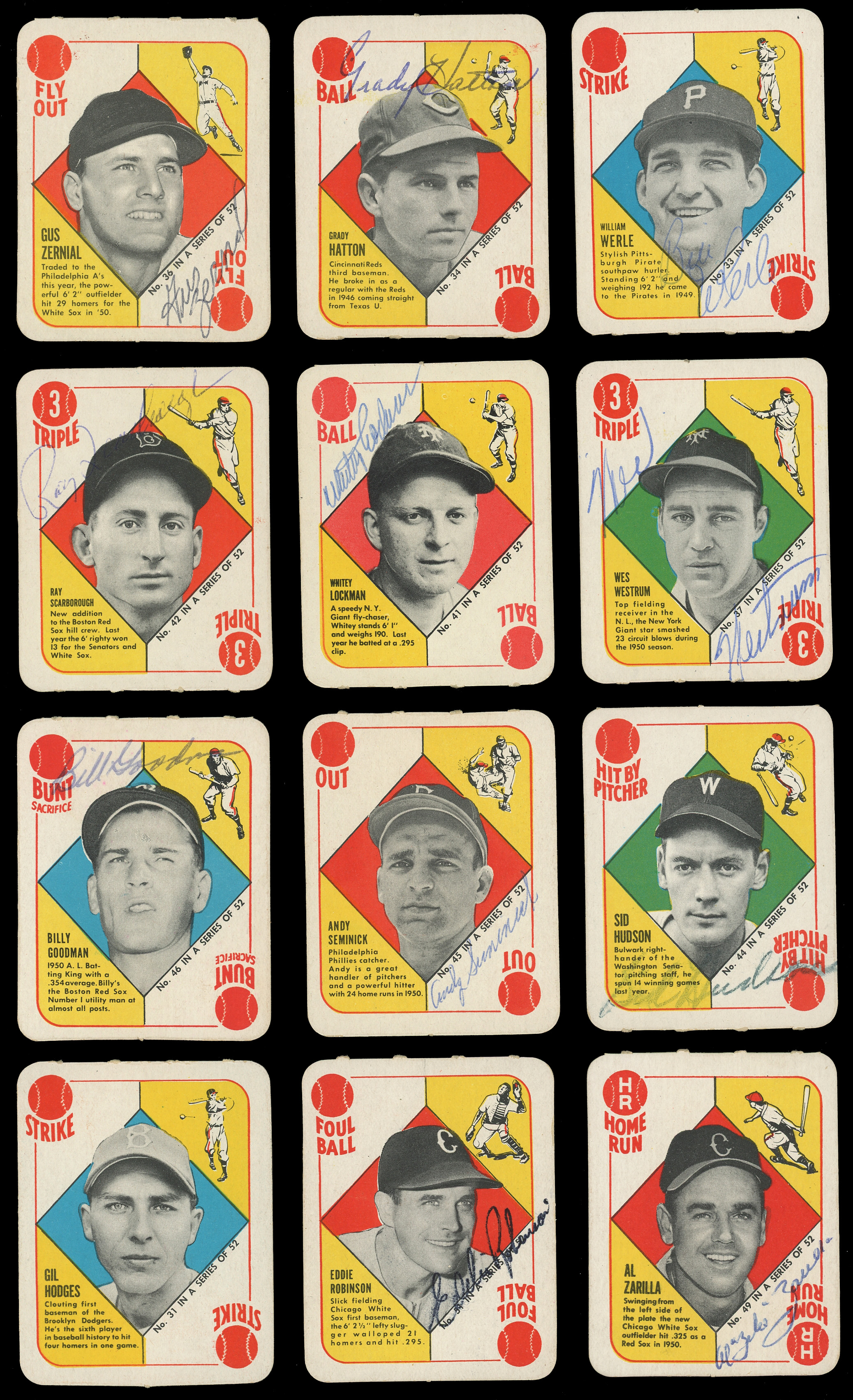Remarkable 1951 Topps Red Backs complete set of (52) with (41) signed cards including tough deceased. The average (“8”) autographs are neatly placed on the primarily (EX to EX-MT) surfaces. Highlights include: