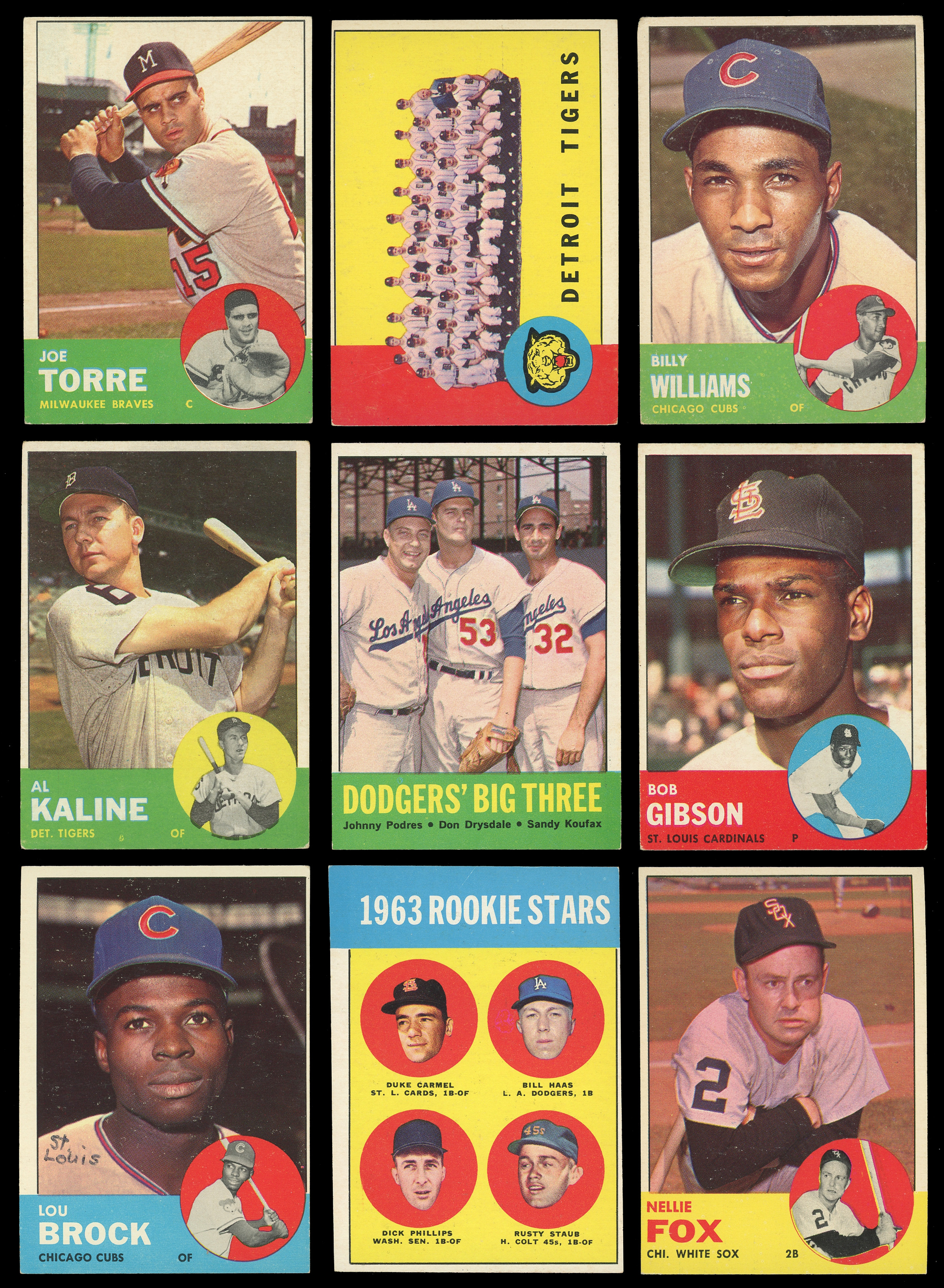 Spotlighted is a 1963 Topps partial set of (405/576) cards with several key Hall of Famers. This colorful assembly generally presents in the (VG-EX to EX) range with the (89) tougher high series averaging similarly. Highlights include: #1 Aaron/Musial/F. Robinson LL (VG-EX), #3 Aaron/Banks/Mays LL (EX-MT), #5 Koufax/Drysdale/Gibson LL (PSA EX-MT 6), #18 Buc Blasters/Clemente (EX-MT), #25 Kaline (VG-EX), #115 Yastrzemski (EX), #120 Maris (VG-EX), #138 Mays/Musial (EX), #173 Mantle/Richardson/Tresh (EX-MT), #242 Aaron/Banks (VG), #275 Mathews (VG), #390 Aaron (VG), #400 F. Robinson (EX), #412 Drysdale/Koufax/Podres (EX), #415 Gibson (VG-EX), #466 Freehan RC (EX), #472 Brock (FR, writing), #490 McCovey (VG-EX), #525 Fox (EX-MT), #544 Staub RC (VG) and #552 Tigers Team (VG).