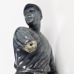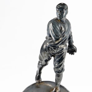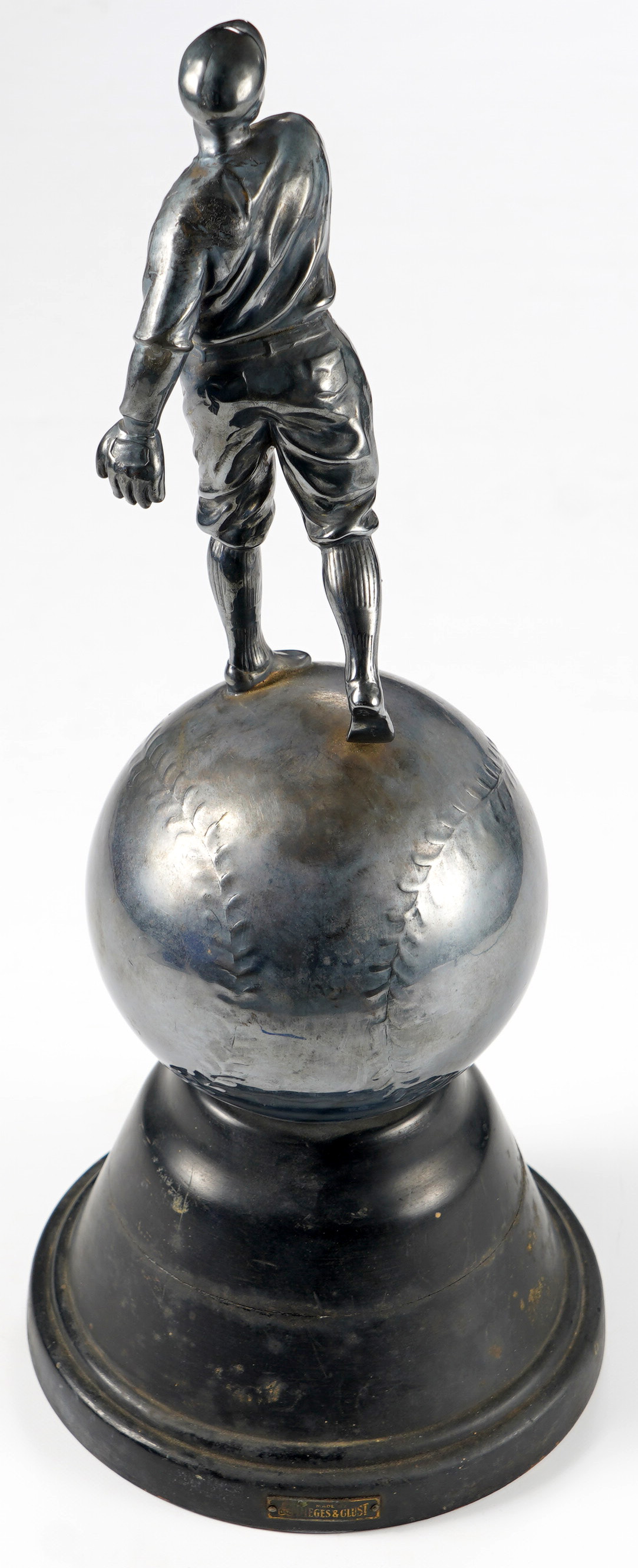 Discover an historic treasure, with the viewing of this 1922 Spalding Tampa Inter-Social League Champions silver-plated trophy. Famous maker Dieges & Clust crafted this antique figural piece, as part of its collector favorite line known as "The Five Figural Spalding Baseball Trophies". Despite the loss of the right arm from the sleeve down, this century-old award remains very impressive. Modeled on a “dead ball” era hurler reminiscent of Christy Mathewson, this majestic trophy reaches a height of nearly 20”, on a wood pedestal base with an 8” diameter. Stacked between the wood base and the pitcher figure is a super-sized metal baseball, adorned with a Spalding logo, just above the junction with the base. A Dieges & Clust logo plate is affixed to the back of the base, readily identifying the maker. Located on the front of the base, is a metal plate ringed with an olive branch wreath and engraved with “Champions Inter-Social League 1922”. The pitcher and baseball bear considerable toning, but are otherwise very appealing, and the painted black wood base shows moderate wear, commensurate with its considerable age.