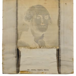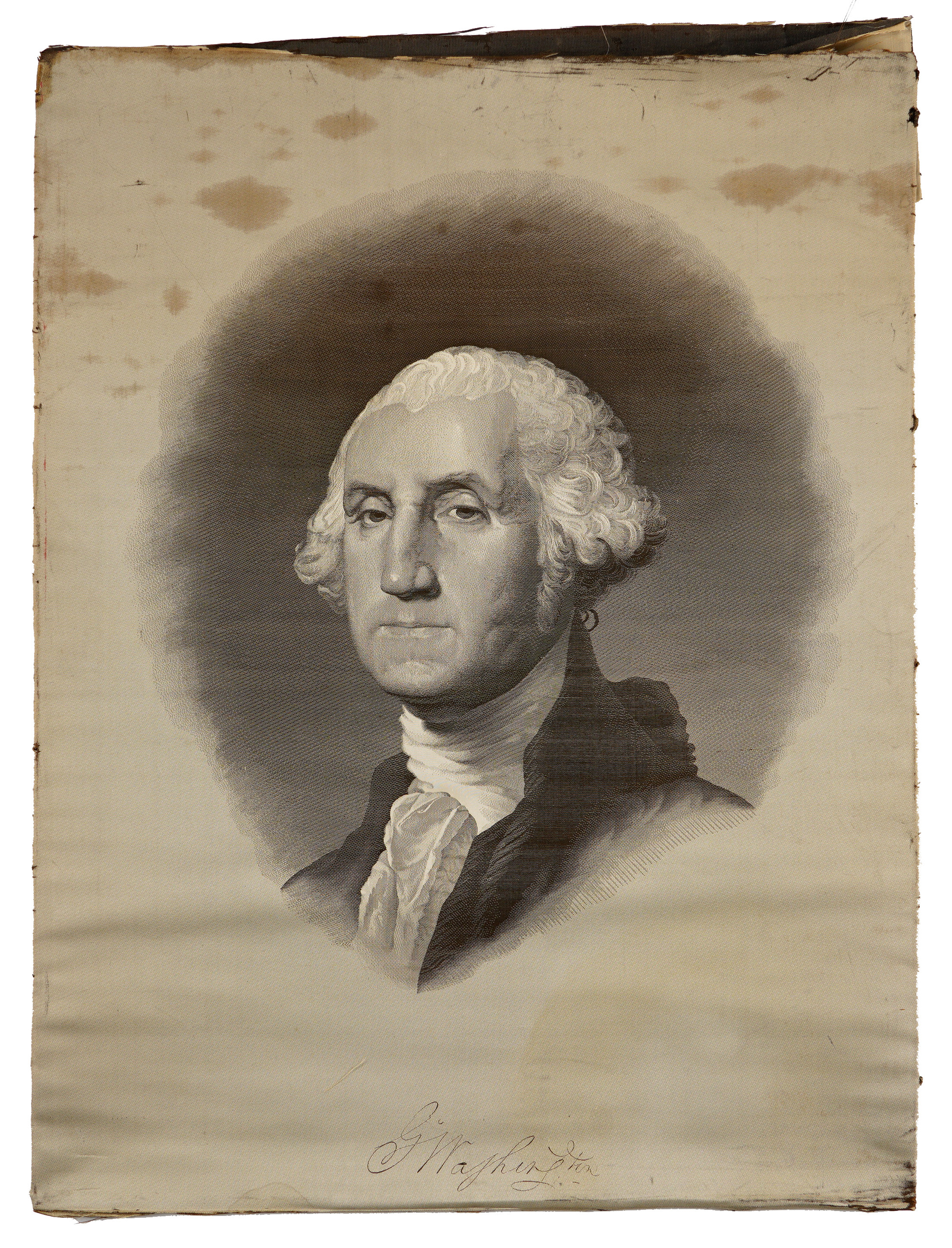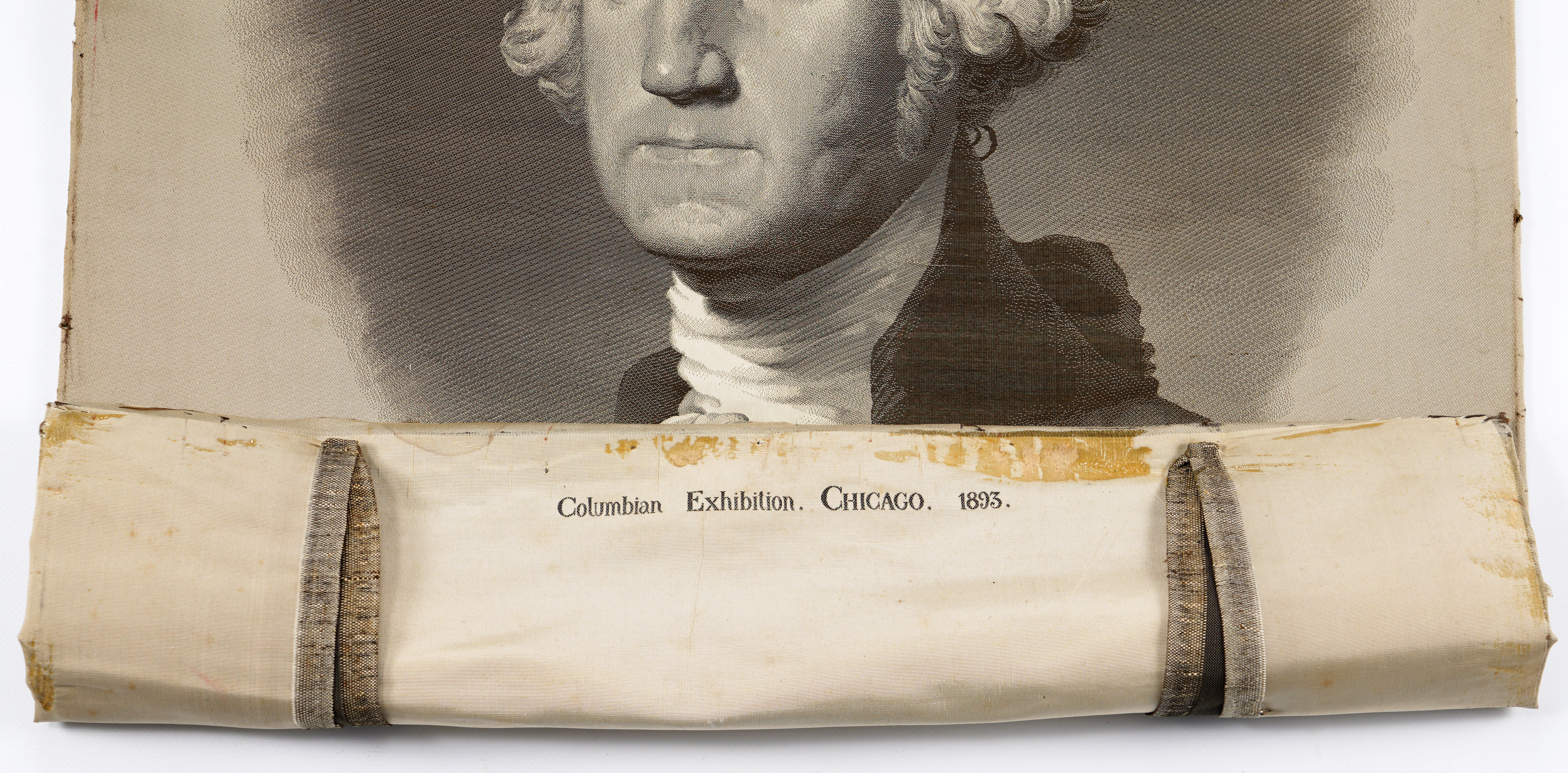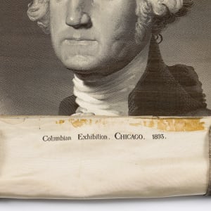 The wonders of the World came to Chicago in 1893, for public admiration at the Columbian Exhibition. Among the many marvelous things found at this “Chicago World’s Fair”, was the offered 1893 George Washingfton silk portrait. This international event was held in honor of the 400th Anniversary of Columbus’ first voyage of discovery to the Americas in 1492. A well-attended, long-running event, this exhibition yielded a host of keepsakes, and this Washington silk ranks as one of the more rare survivors. The perimeter is folded and pinned back 4” to 8” per side, and the visible obverse area is approximately 18” x 23”. Our first president is rendered in a stately engraving style portrait, with a facsimile of his signature below. Located on the bottom border, folded to the back, is the legend “Columbian Exhibition. Chicago. 1893,”. Sporadic staining is evident across the field area at top, though the bright, distinct image of the Founding Father is unmolested by this condition. As can expected the folded edges show age-appropriate wear, including small cracks, minor fraying, and moderate surface loss. These conditions would readily be concealed in framed display, and this majestic antique portrait presents handsomely, with a great period authentic look.