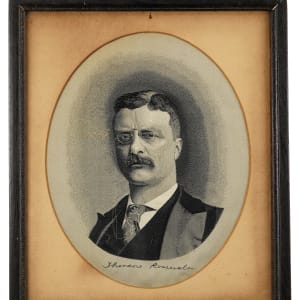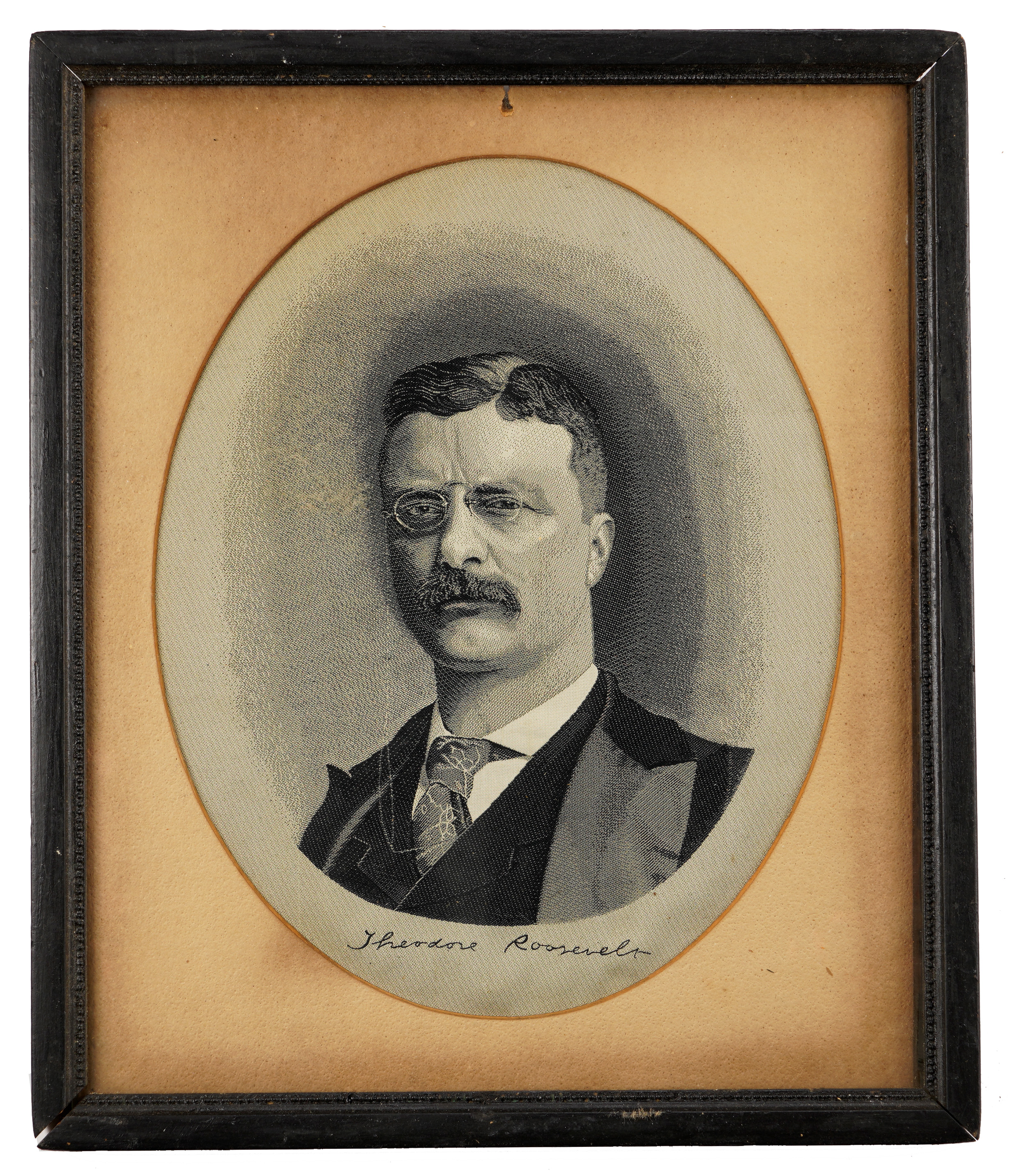 Roosevelt looks the part of a hale, yet wizened figure of authority in this antique silk, which also features a facsimile signature below his regal image. Framed to overall dimensions of 11"" x 13", this silk portrait is matted in an oval window for dynamic effect. While the frame shows age-appropriate wear, it remains serviceable, with a strong look of period authenticity. There's a small hole in the matting at the twelve o'clock position, located well away from the image area, and the silk retains a good deal of original integrity, with wear being relatively modest.